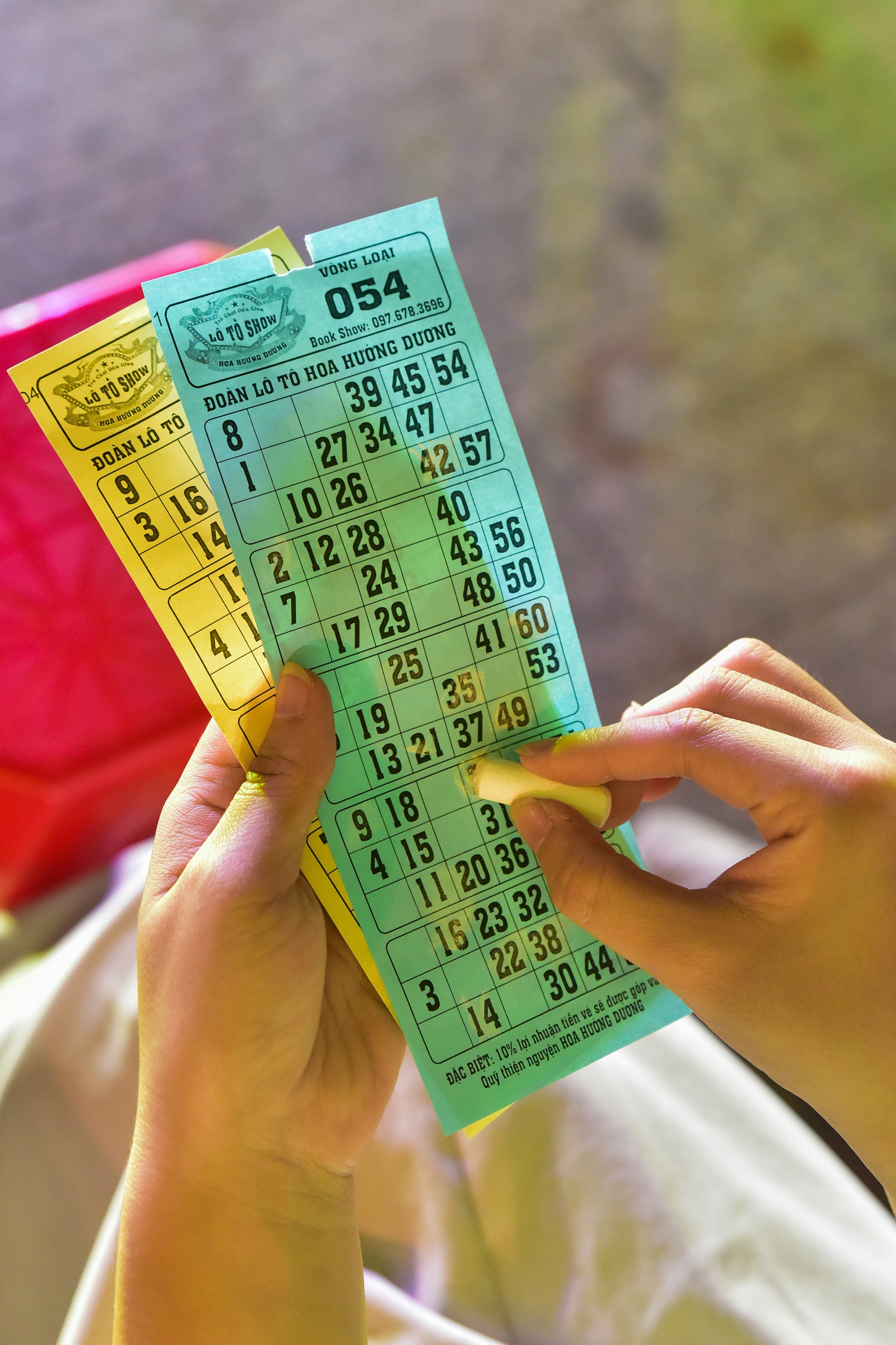 | Khán giả cầm trên tay tấm vé có các con số ngẫu nhiên trong mỗi vòng, chờ đợi lồng cầu quay. Các nghệ sĩ trên sân khấu hát nhạc pop, vọng cổ, cải lương, thậm chí cả màn tấu hài duyên dáng... để kêu số một cách sáng tạo. |