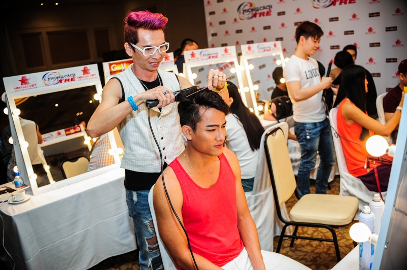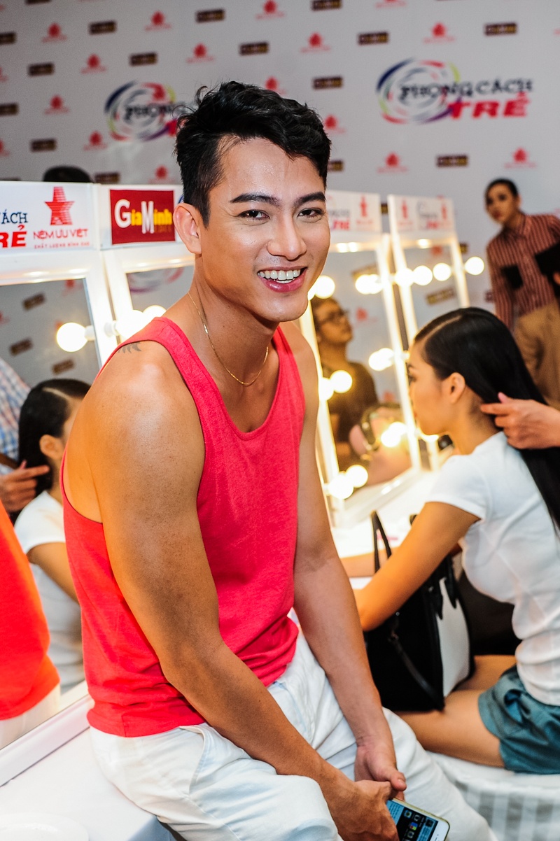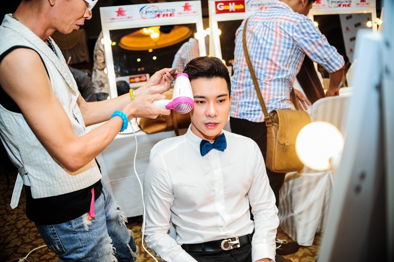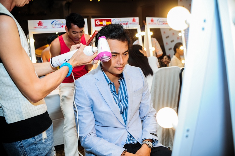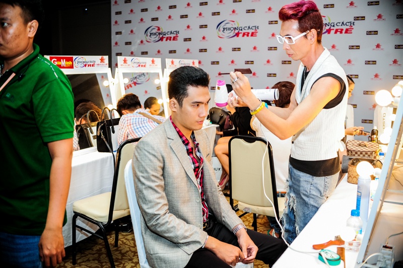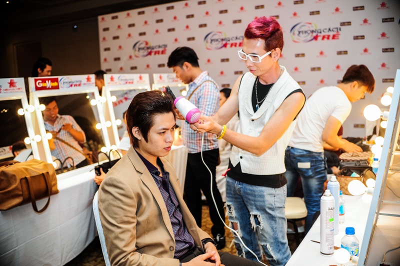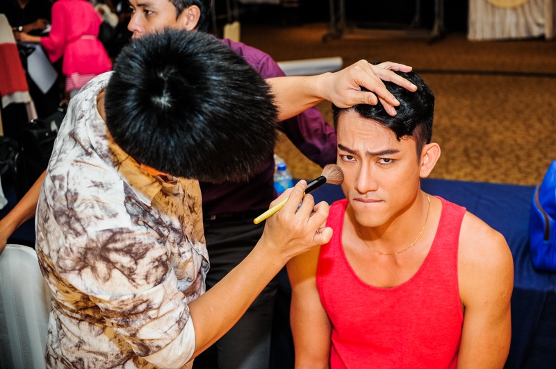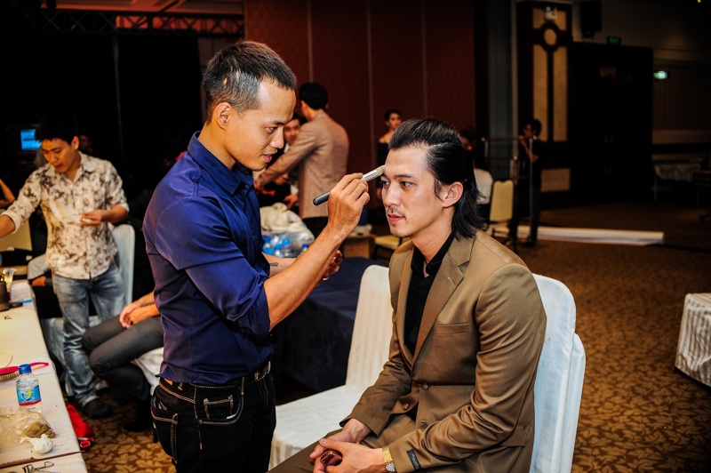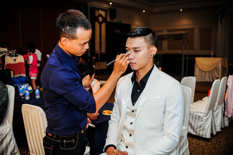 Giống người mẫu nữ, trước khi lên sàn diễn, các chàng trai đều được yêu cầu trang điểm tạo khối giúp gương mặt tươi sáng và bắt ánh đèn sân khấu.