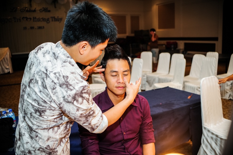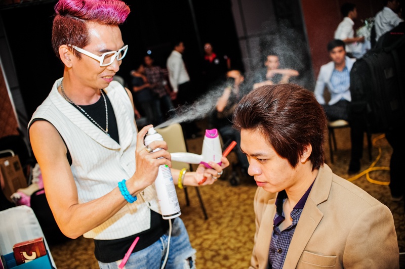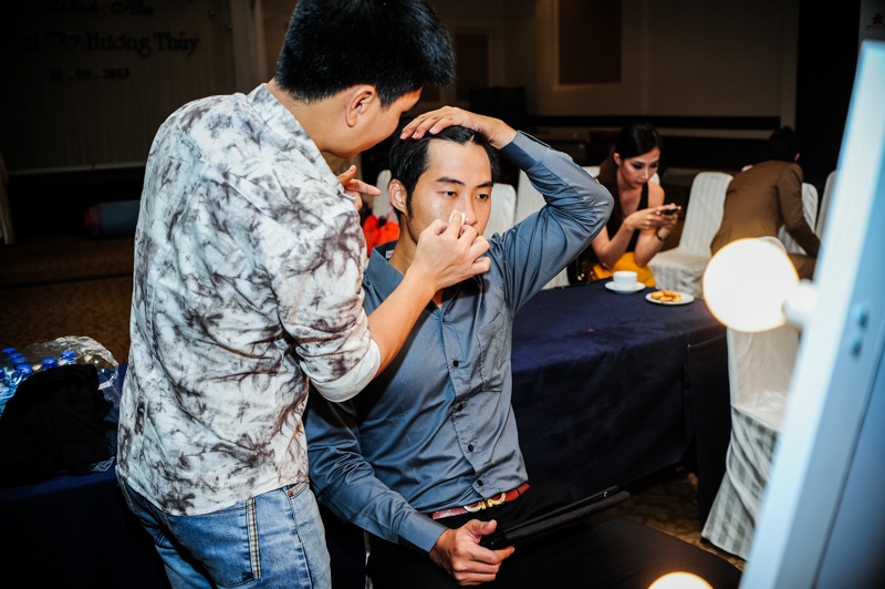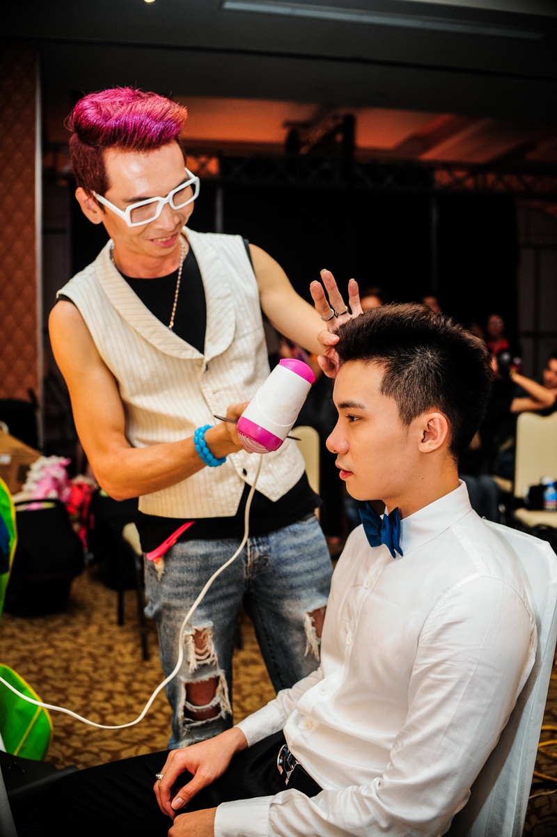 Phần trang điểm hoàn tất, Huy Dinh được chuyên viên trang điểm tạo kiểu tóc.
