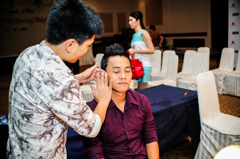 Người mẫu - ca sĩ Huy Dinh cũng bận rộn phía sau hậu trường, trong lúc được trang điểm, chuyên viên make-up tư vấn bí quyết giúp anh giữ được làn da tươi trẻ.