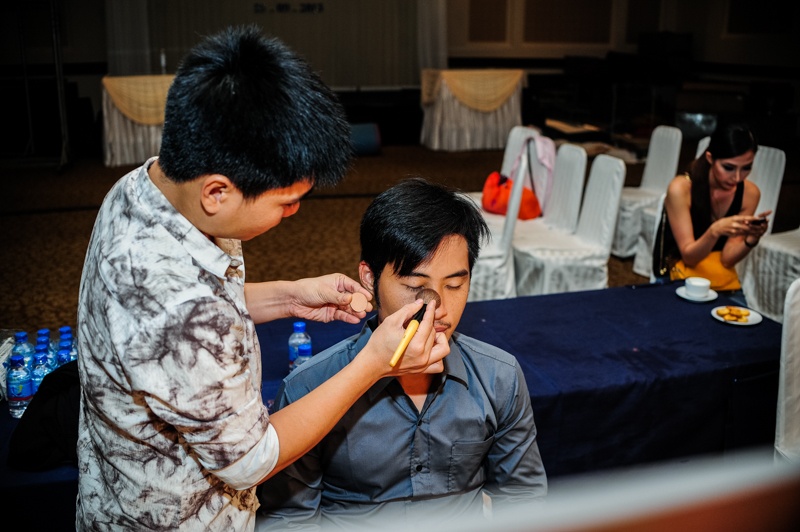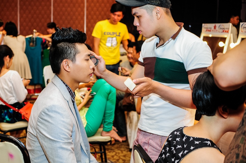 Người mẫu Trần Qúy đến trễ so với nhiều bạn diễn, anh được chuyên viên trang điểm dậm phấn nền.