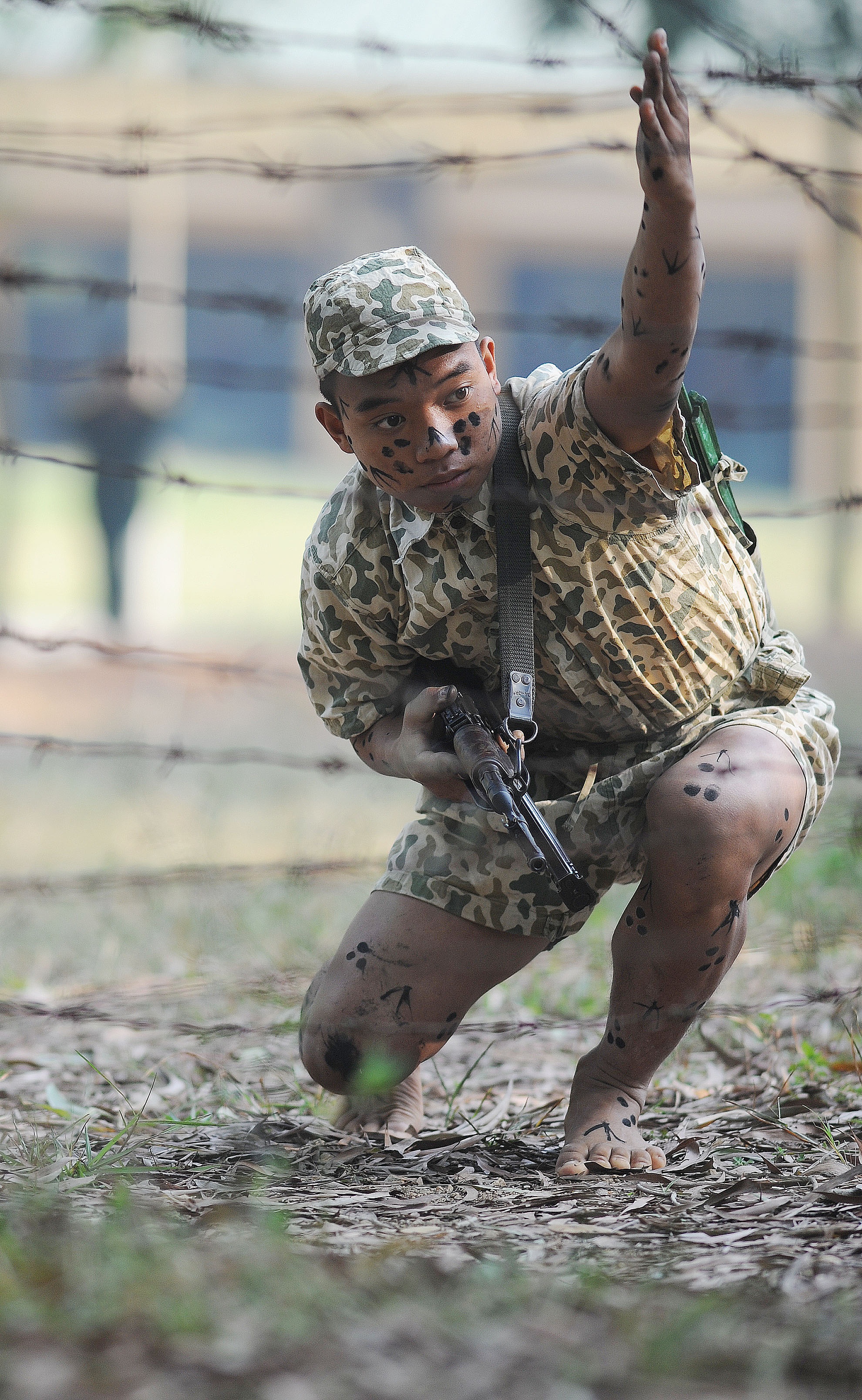 | Các chiến sĩ trẻ tìm cách vượt qua bẫy chông dày đặc. |