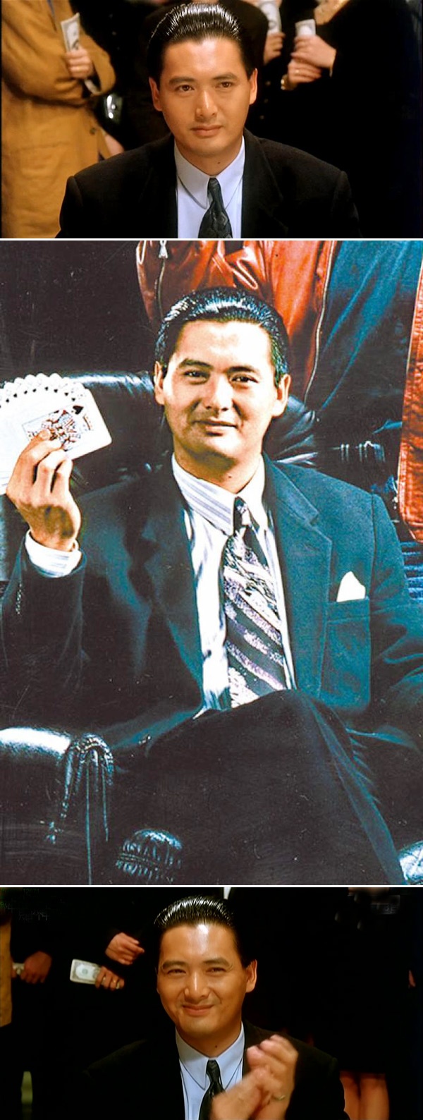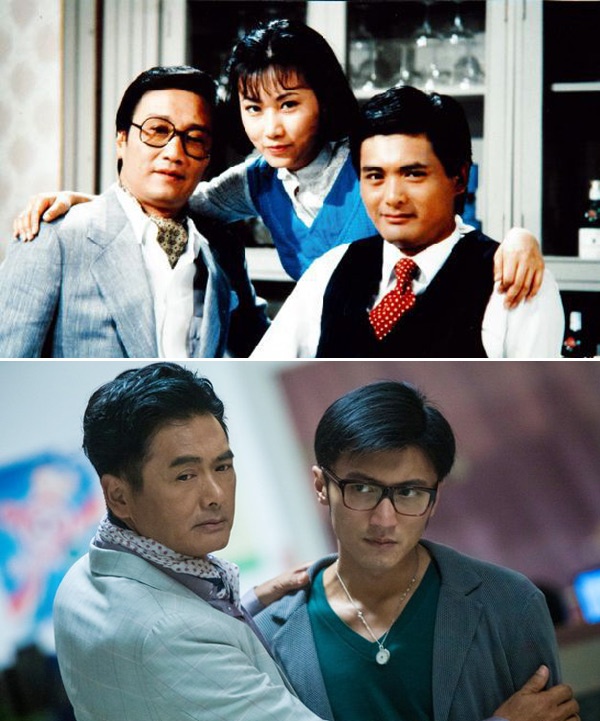 | Châu Nhuận Phát cùng Tạ Hiền, Uông Minh Thuyên trong bộ phim truyền hình Thiên vương quần anh hội (ảnh trên) và hơn 30 năm sau với Tạ Đình Phong trong Sóng gió sòng bài Ma Cao. |