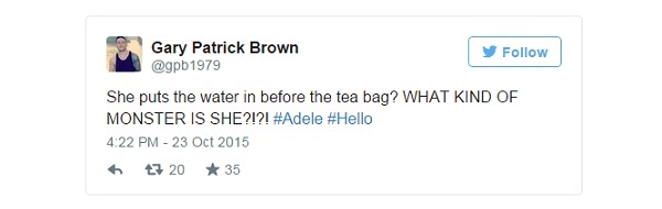 | Trong MV Hello, nữ ca sĩ pha trà bằng cách cho nước nóng vào tách rồi sau đó thả túi trà. Tuy nhiên, mọi người vẫn thường làm ngược lại các bước mà Adele đã thực hiện. Một tài khoản twitter hài hước bình luận "Cô ấy cho nước nóng vào cốc trước túi trà? Liệu có ấy có đang pha trà theo kiểu quái vật?". |