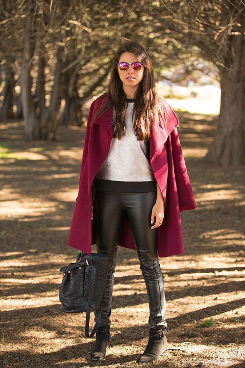 Cách mix ấn tượng giữa áo choàng và quần da ôm sát cho cô nàng cá tính.