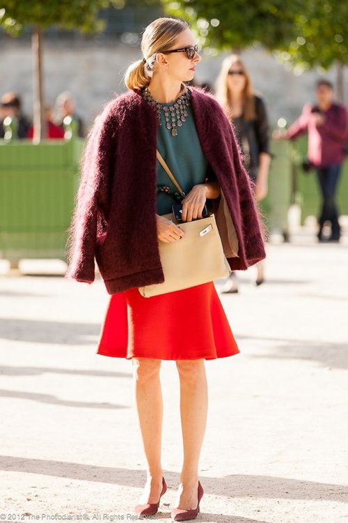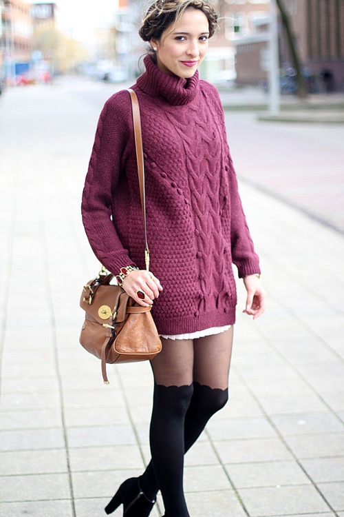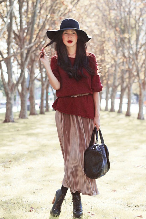 Màu huyết dụ xuất hiện nhiều nhất có lẽ phải kể đến những chiếc áo len có kiểu dáng vintage. Bạn có thể mix chúng kèm váy xòe, váy midi, váy maxi hoặc đơn giản là jeans, quần âu để tạo nên những bộ trang phục đường phố đẹp mắt.