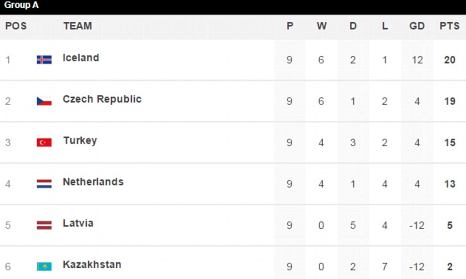 | Vị trí của các đội ở bảng A sau lượt trận thứ 9. ĐT Hà Lan phải chờ lượt trận cuối với hy vọng ĐT Thổ Nhĩ Kỳ thua Iceland, đồng thời họ giành chiến thắng trước Séc mới có thể giành suất đá play-off. |
