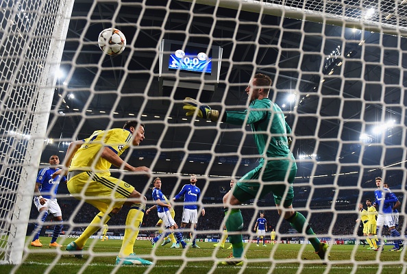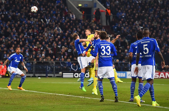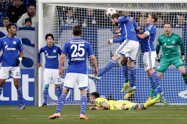 | Trước khi hiệp 1 khép lại, hậu vệ Jan Kirchhoff có pha đốt lưới nhà ở tình huống 3 cầu thủ Schalke cùng nhảy lên tranh bóng. |