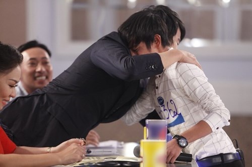 Nhạc sĩ Thanh Bùi trao tấm vé vàng vào vòng trong cho chàng "hot boy bán kẹo" Vĩnh Phúc. |