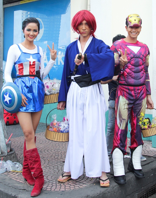 | Nhóm H'Hen Niê, Hoàng Anh Tú và K'Bơi thực hiện thử thách bán hàng trên đường phố. |