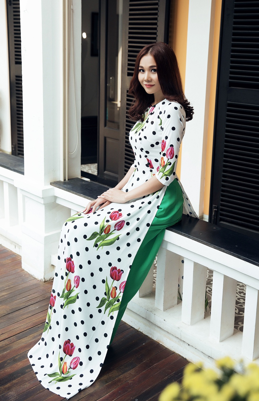 | Cùng ý tưởng áo dài chấm bi hơi hướng cổ điển nhưng thiết kế trong ảnh được phối quần lụa xanh, tà áo được điểm hoa bắt mắt. |