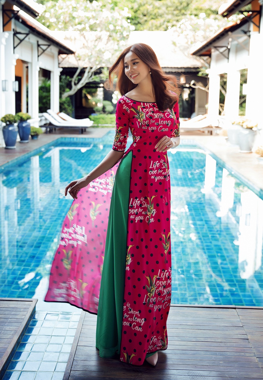 | Bên cạnh họa tiết hoa và chấm bi, nhà thiết kế còn đưa slogan lên áo dài để gây ấn tượng. |