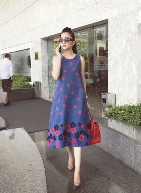 Linh Nga nhẹ nhàng dạo phố với đầm dáng suông, điểm họa tiết hoa thêu cổ điển.
