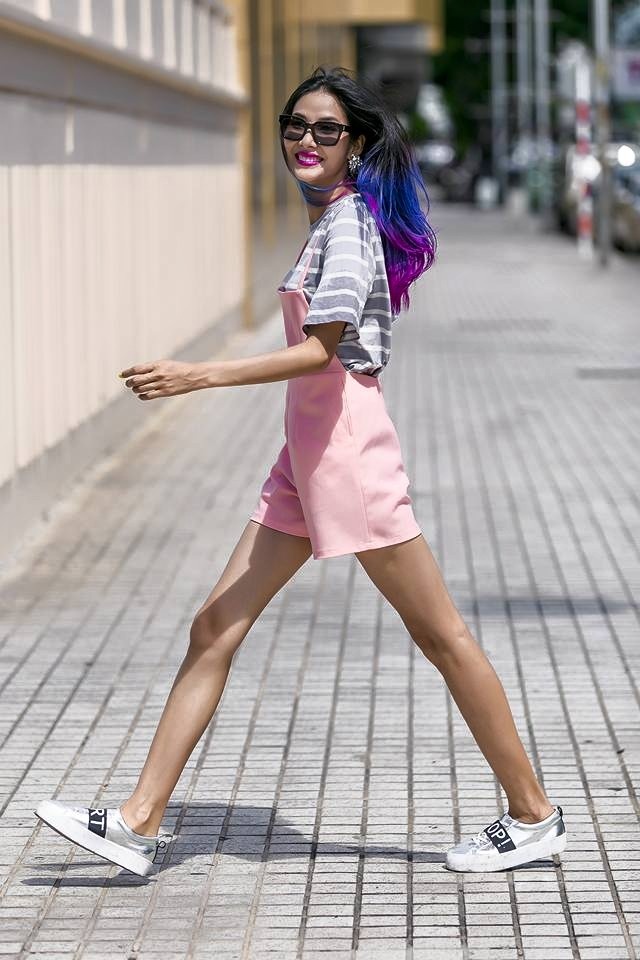 | Hoàng Thùy tạo ấn tượng phong cách với màu tóc nhuộm ombre cá tính. Trang phục yếm hồng tinh nghịch phối đẹp mắt cùng giày thể thao. |