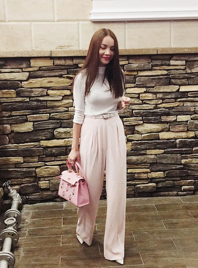 | Set đồ thanh lịch, màu nhã khá vừa vặn vóc dáng nhỏ nhắn của Yến Trang. Người đẹp sinh năm 1984 phối túi hiệu đồng màu ăn ý. |