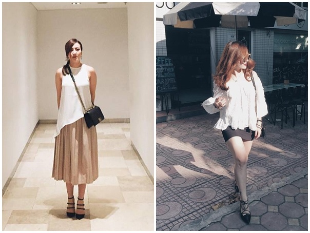 | Đối lập chị gái, Yến Nhi có phần cá tính và hiện đại hơn. Cô chuộng màu trắng đen cùng phụ kiện sandals hợp mốt. |