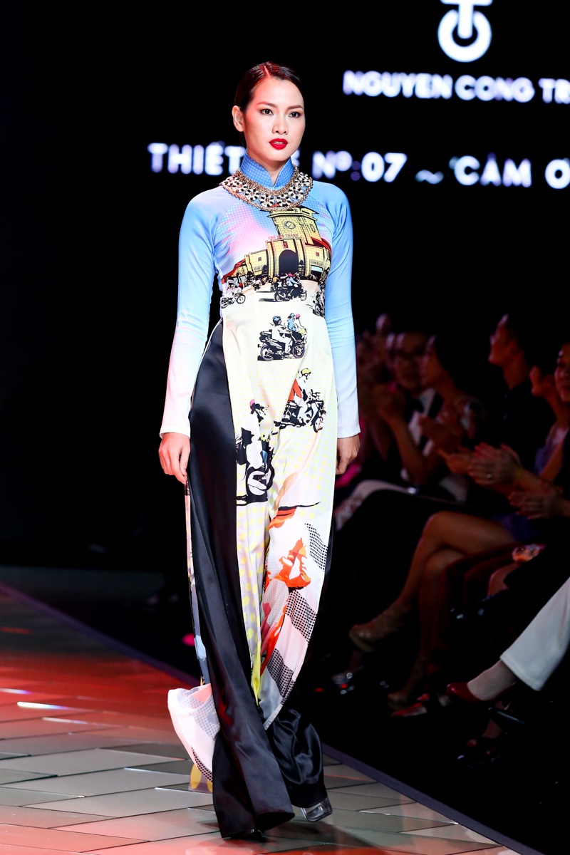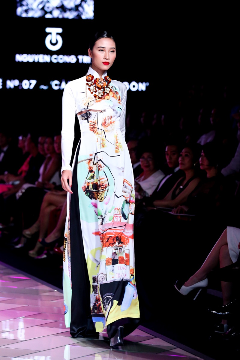 Người mẫu Anh Thư trình diễn thiết kế áo dài in hình chợ Bến Thành.
