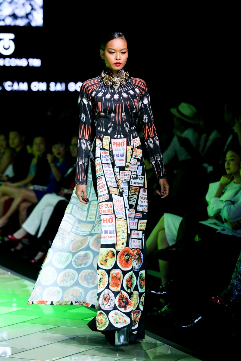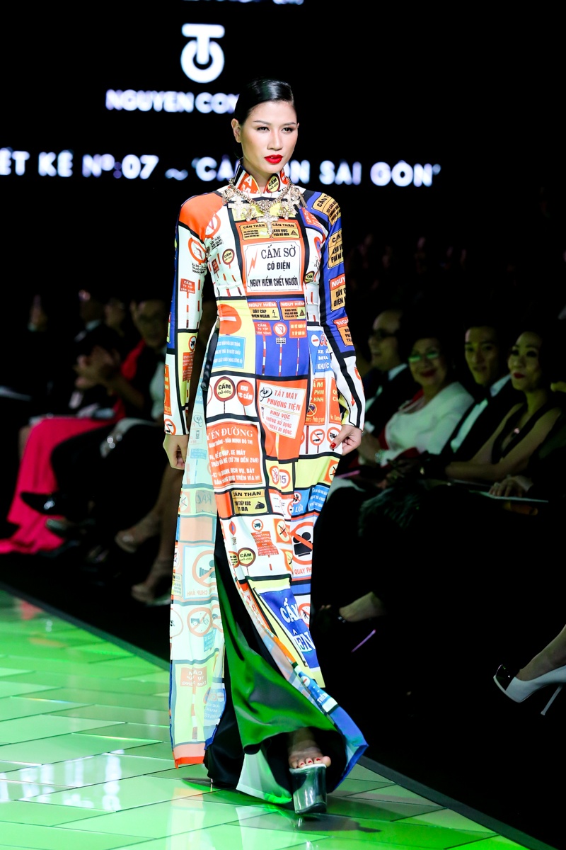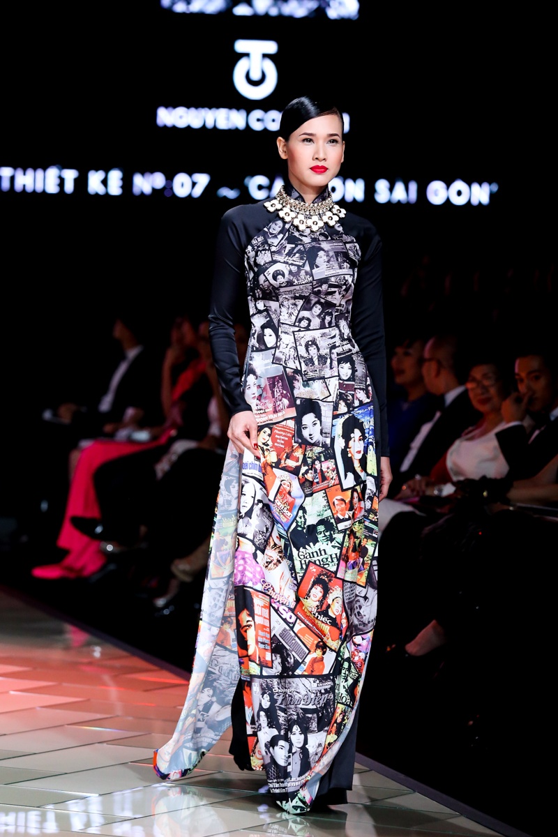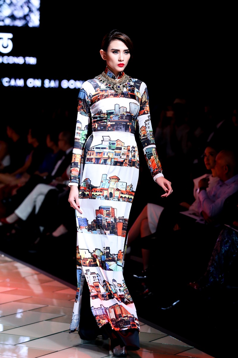 | Trên nền nhạc mang âm hưởng hiện đại, pha lẫn nét cổ điển với những điệu hò, tiếng rao có âm vọng kéo dài, dàn người mẫu trình diễn BST áo dài mang đậm dấu ấn của đặc trưng của Sài Gòn bao gồm: những con phố, góc chợ, ẩm thực, tôn giáo, giao thông... Nét đặc trưng văn hóa của Sài Gòn thập niên 70 được tái hiện sinh động thông qua họa tiết in ấn trên nền vải lụa. |