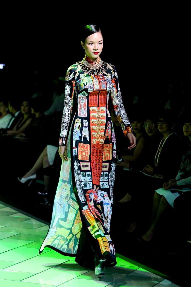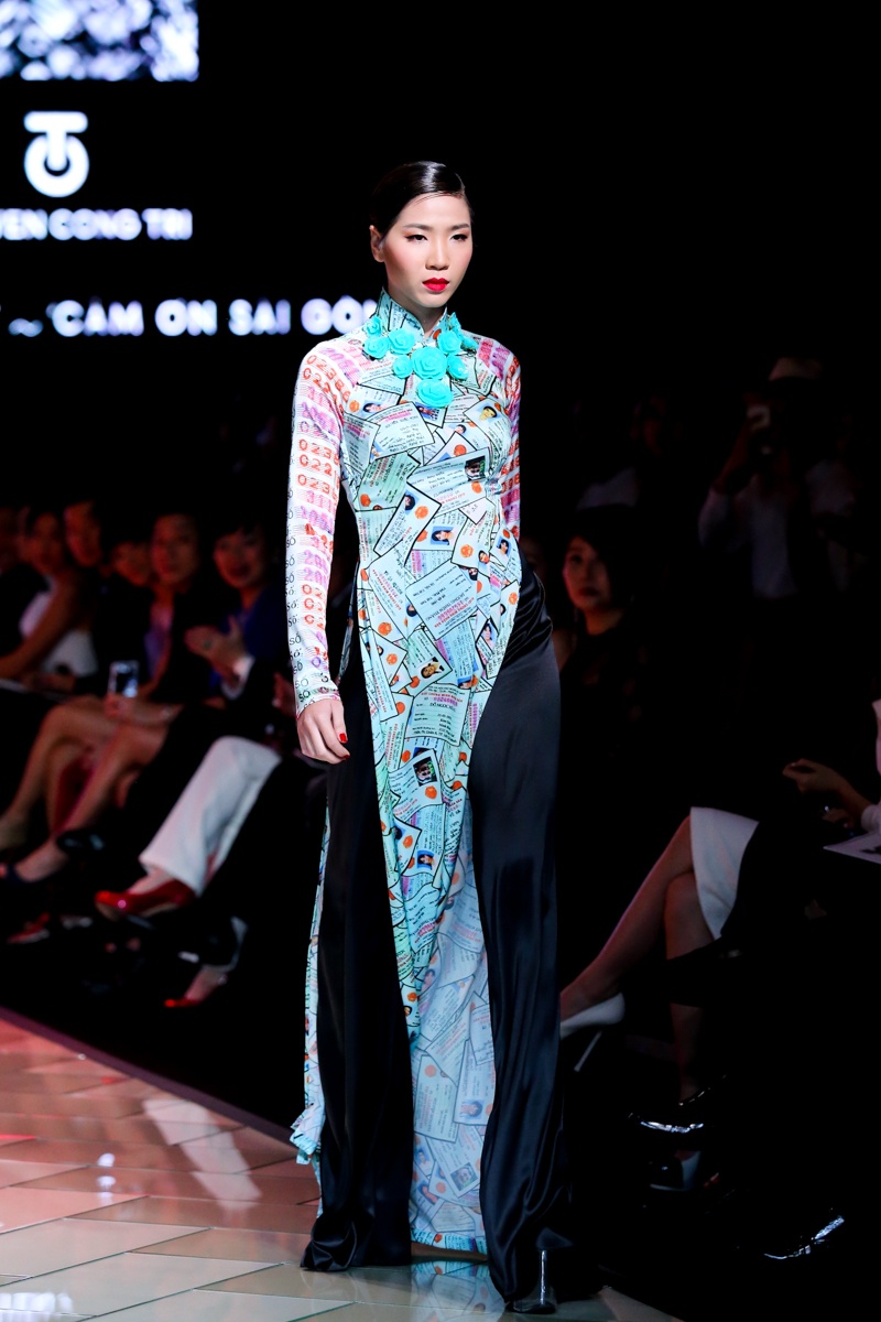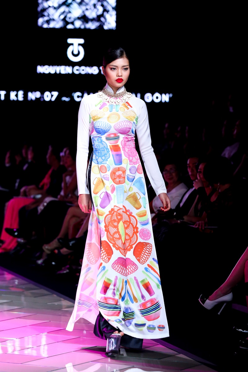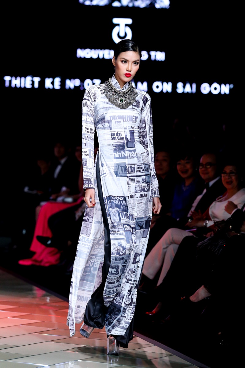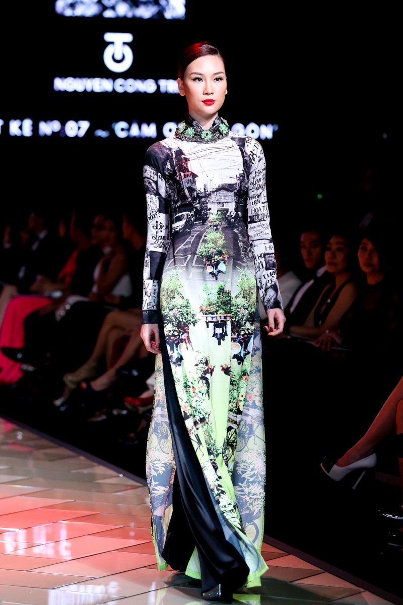 | Trên nền nhạc mang âm hưởng hiện đại, pha lẫn nét cổ điển với những điệu hò, tiếng rao có âm vọng kéo dài, dàn người mẫu trình diễn BST áo dài mang đậm dấu ấn của đặc trưng của Sài Gòn bao gồm: những con phố, góc chợ, ẩm thực, tôn giáo, giao thông... Nét đặc trưng văn hóa của Sài Gòn thập niên 70 được tái hiện sinh động thông qua họa tiết in ấn trên nền vải lụa. |