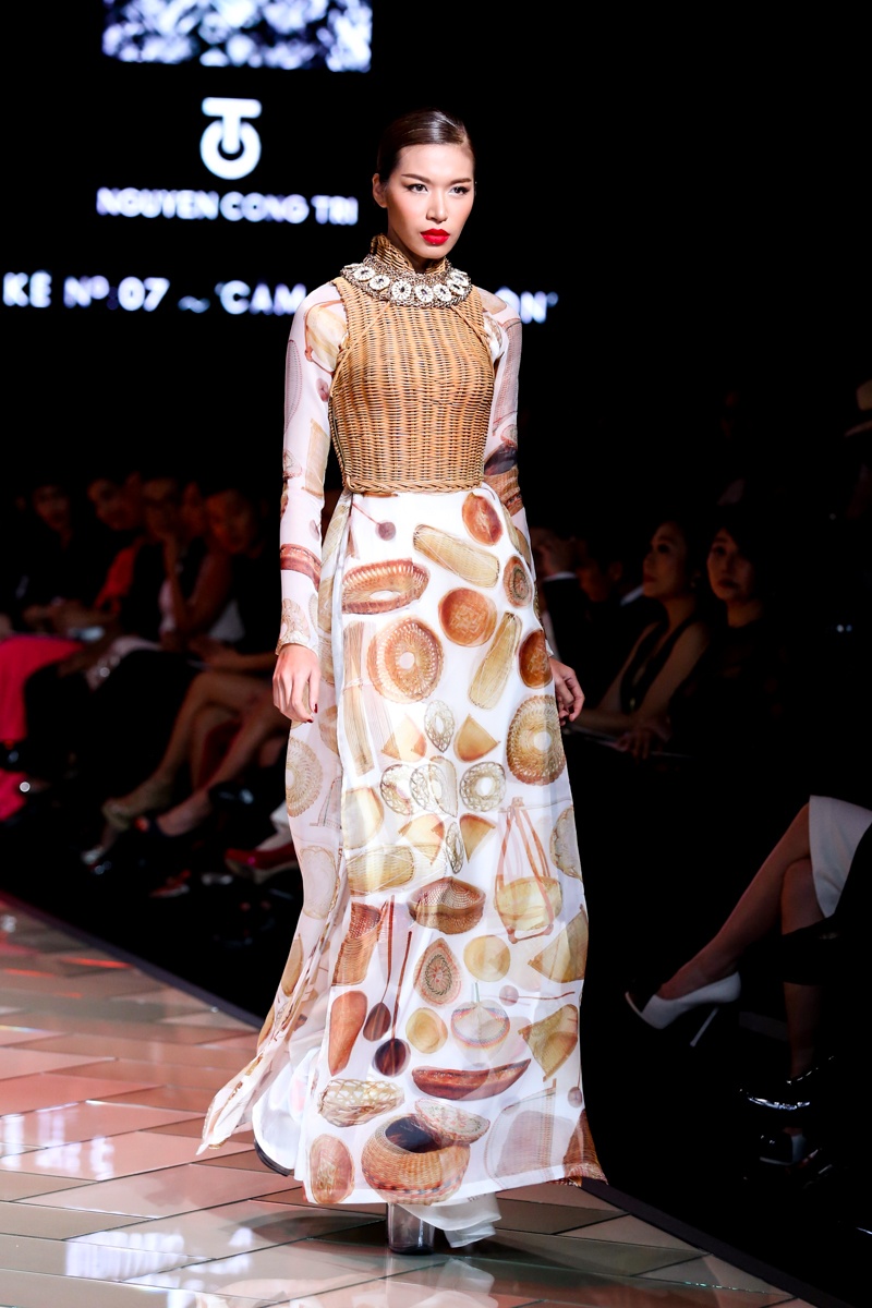 Minh Tú cá tính trong chiếc áo dài in họa tiết của nghành nghề thủ công bao gồm các vật dụng mây tre được đan lát tỉ mỉ.