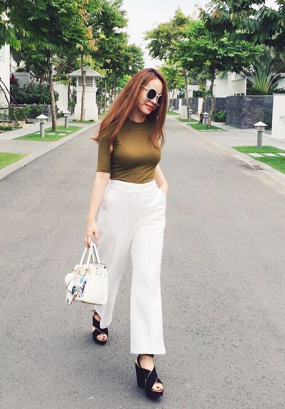 | Yến Trang lăng xê mốt quần ống rộng. Cô mix khéo léo giữa áo thun cao cổ bó sát và quần sáng màu, giày đế xuồng tôn dáng. |