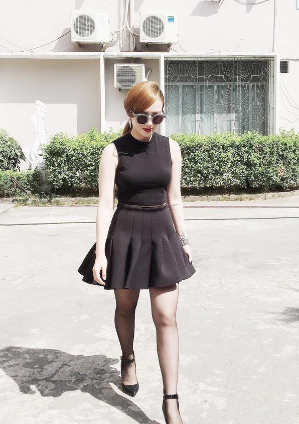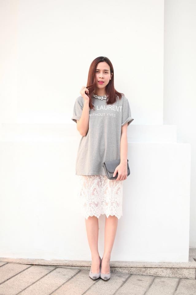 | Bà mẹ một con Lưu Hương Giang chọn tông màu nhã nhặn khi xuống phố. Lần này, nữ ca sĩ mix áo thun xám cùng chân váy ren nữ tính và không kém phần thoải mái. |