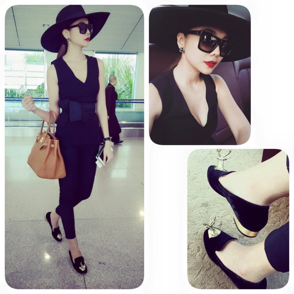 | Thanh Hằng chọn set trang phục tối màu khi đi dạo trên đường phố. Trong ảnh, cô khoe phong cách hiện đại, phá cách. Đôi giày có họa tiết lạ mắt làm điểm nhấn cho tổng thể. |