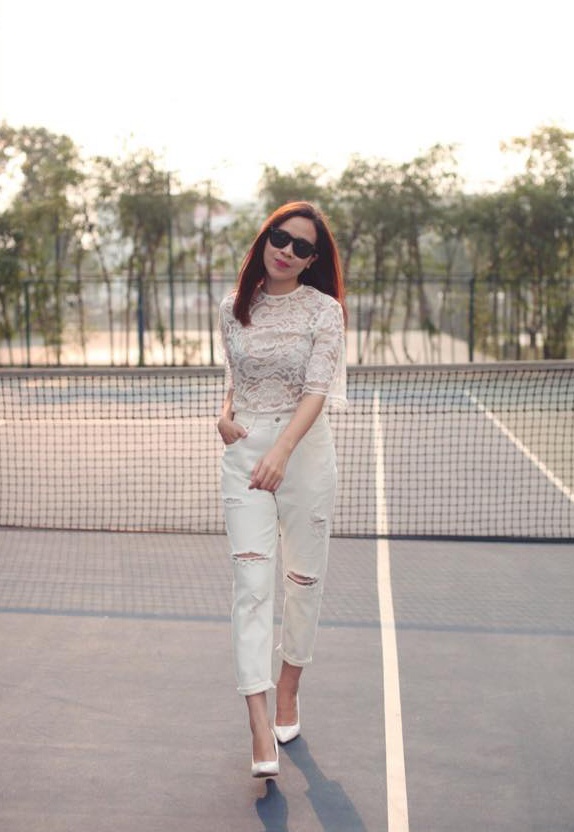 | Một ngày khác, bà xã nhạc sĩ Hồ Hoài Anh diện quần jeans xé gam màu trắng mix ăn ý cùng áo crop-top ren. |