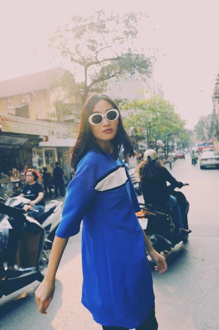 | Trang Khiếu xuống phố với phong cách thể thao khỏe khoắn. Cô diện áo thun xanh hiện đại, phụ kiện kính râm tạo điểm nhấn cho hình ảnh cá tính. |