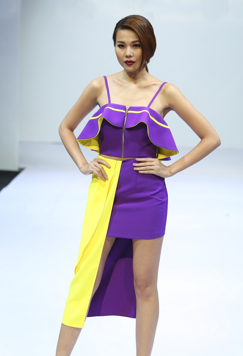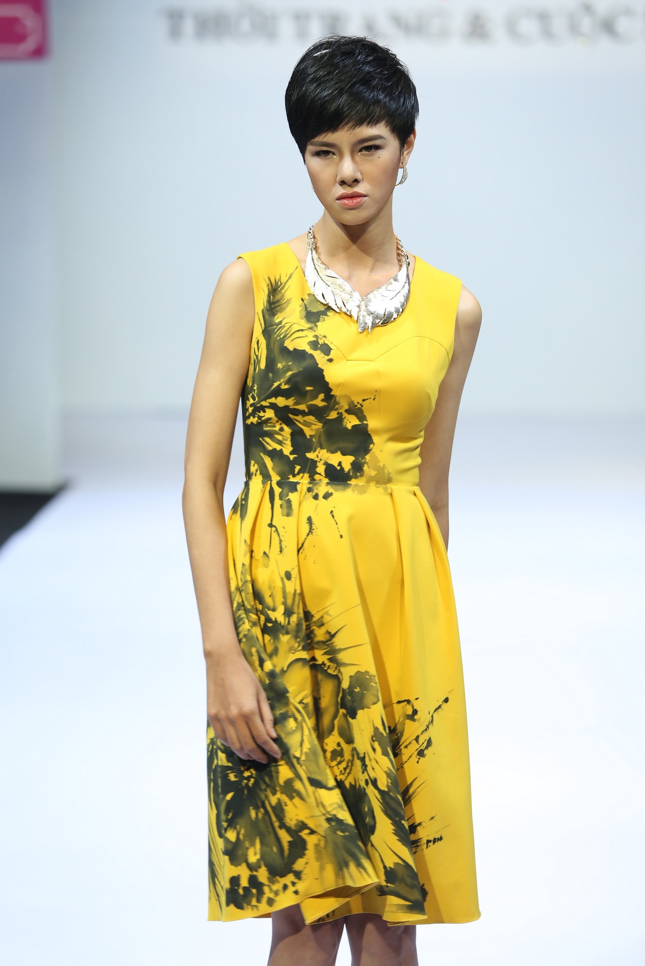 | Hà Đỗ thể hiện thiết kế gam vàng bắt mắt, được in họa tiết sáng tạo trên thân áo, chân váy. |