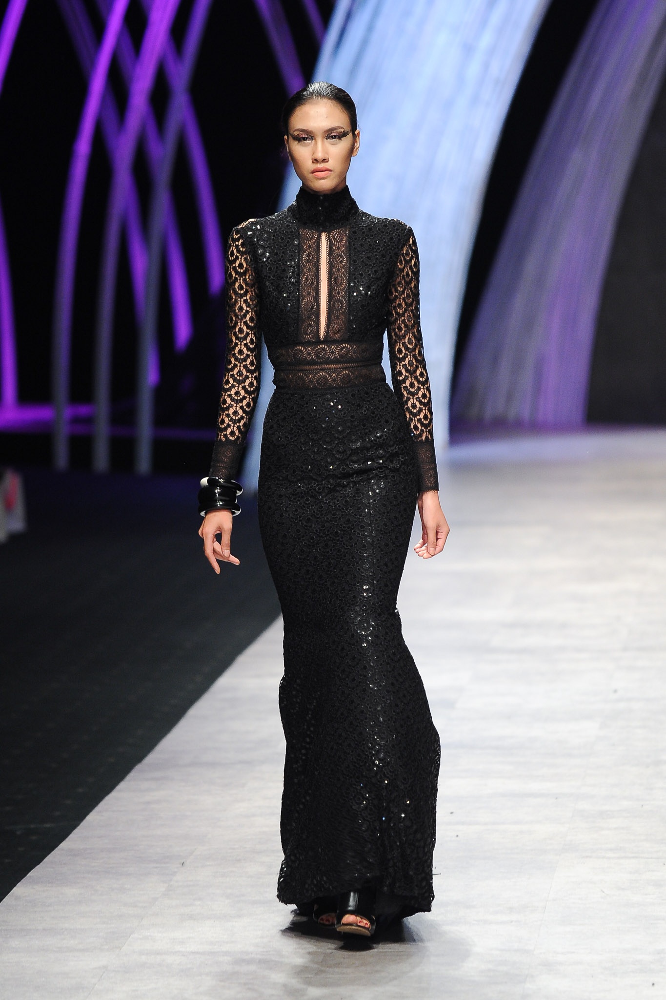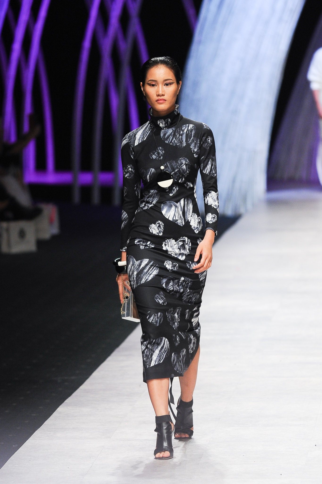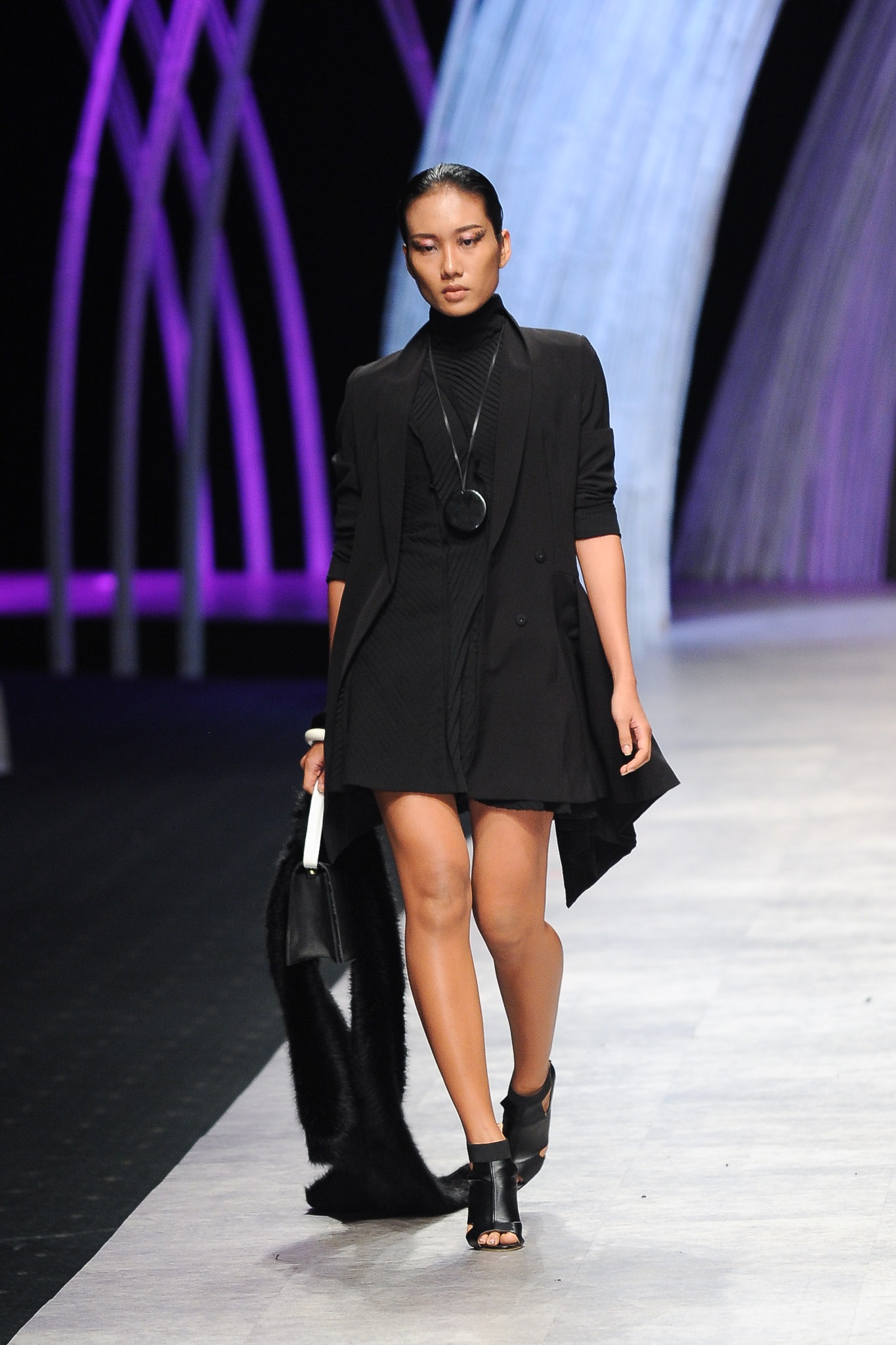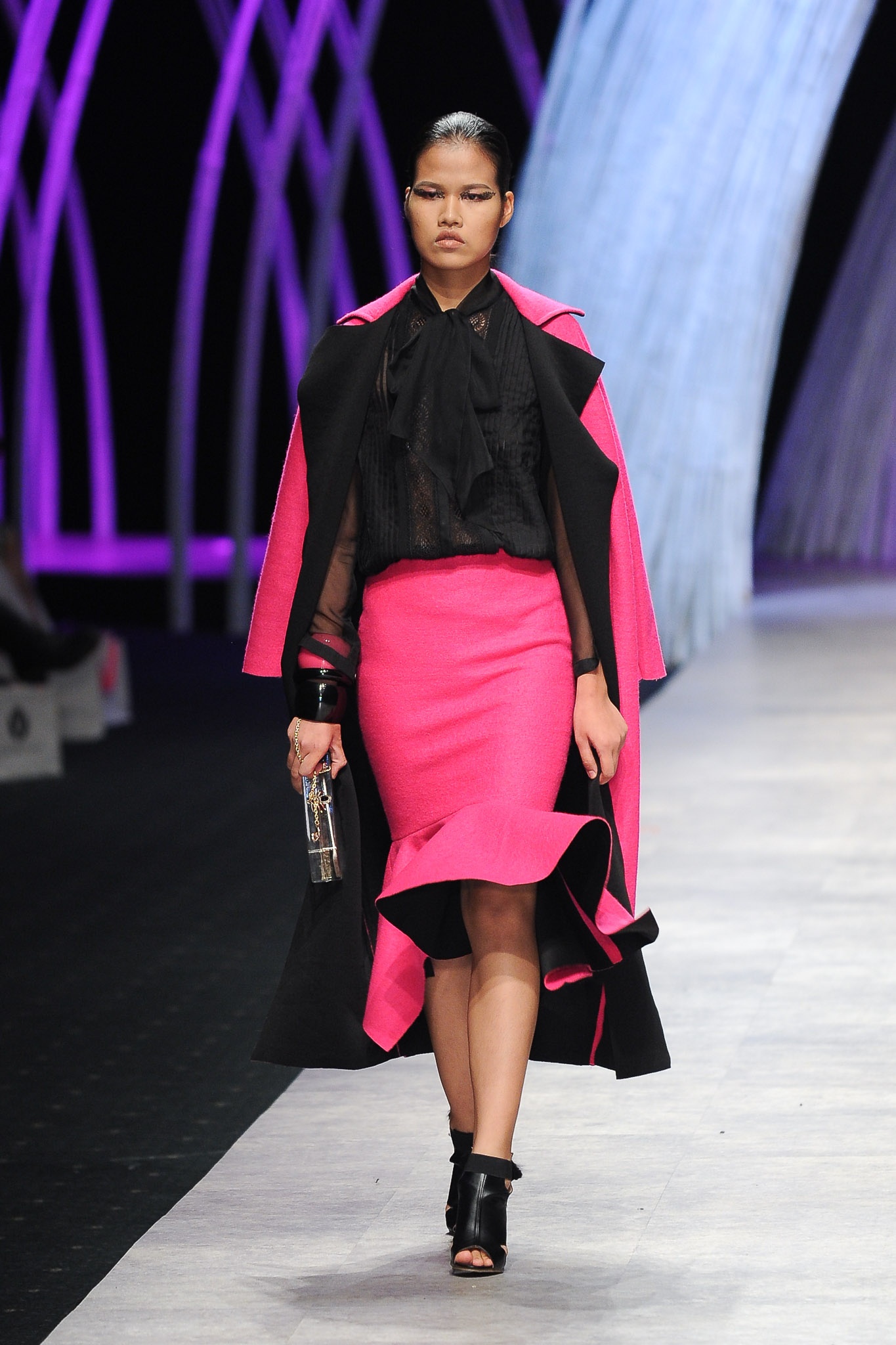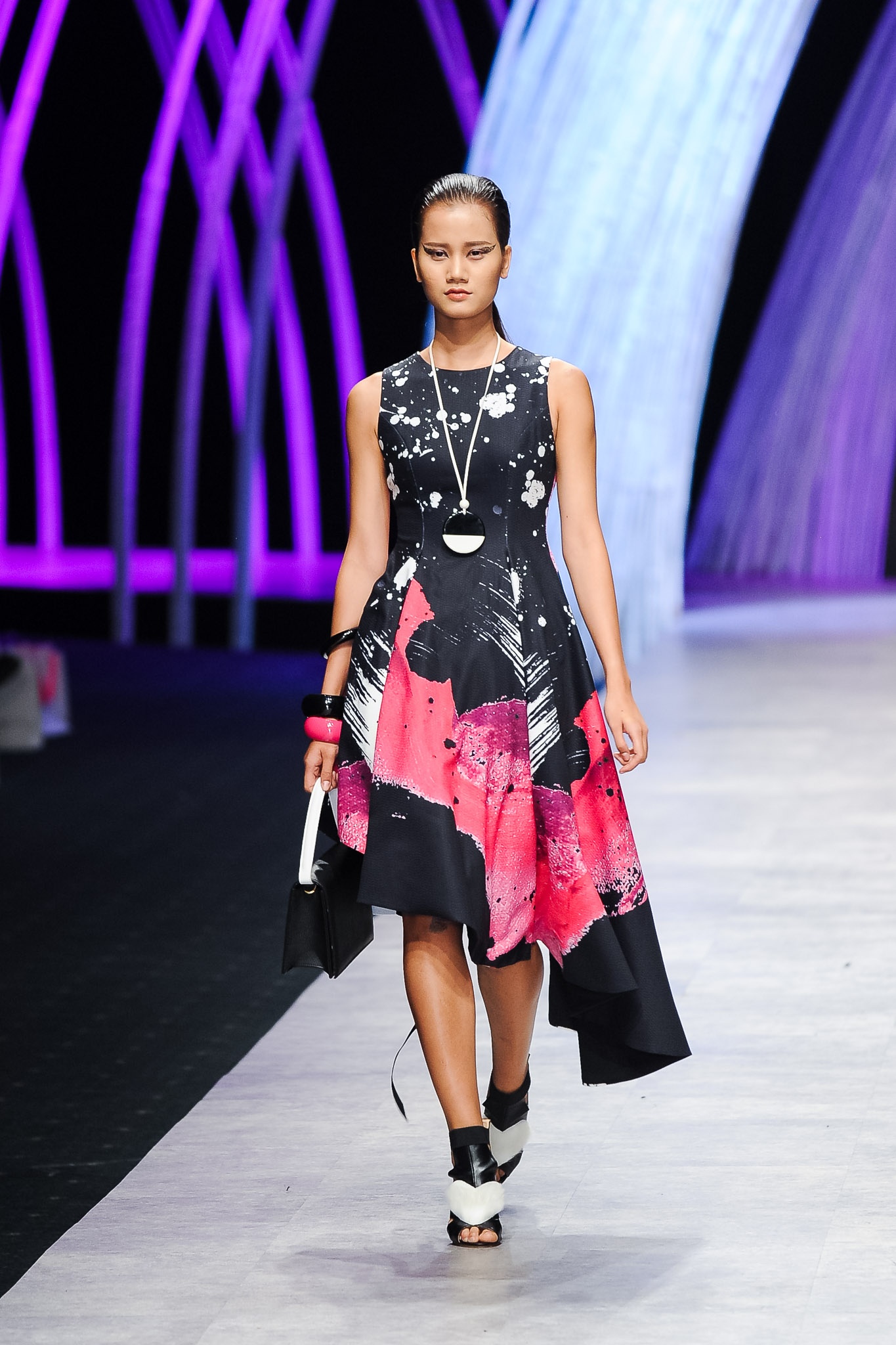 | Chân dài Hồng Vân - thí sinh Vietnam's Next Top Model 2015 - trình diễn bộ cánh cổ điển, tông màu đen hồng ấn tượng. |