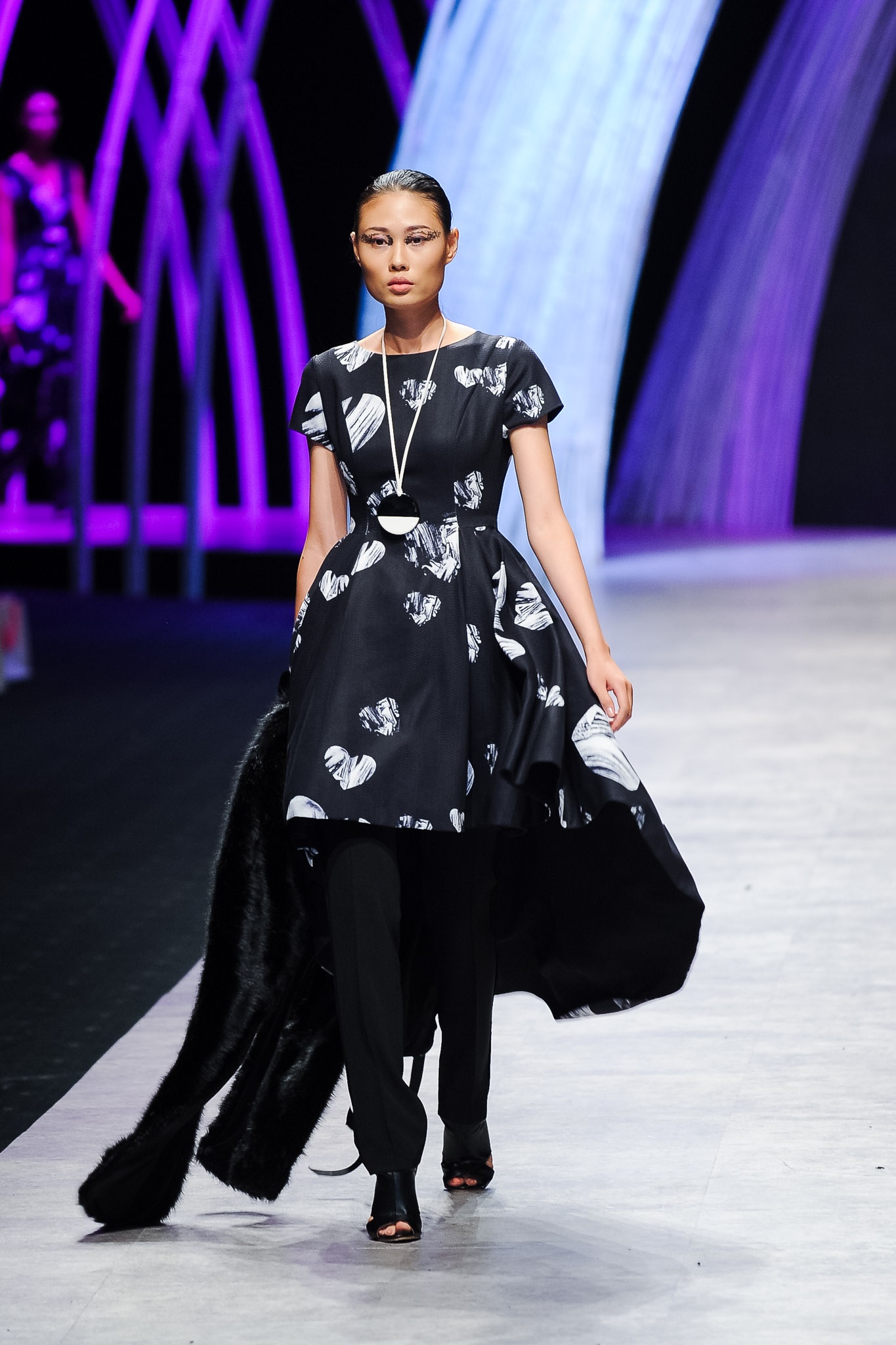 | Đào Thị Thu - thí sinh Next Top mùa 6 - trình diễn thiết kế cổ điển kín áo, họa tiết trái tim bám sát chủ đề bộ sưu tập #Alltheloves. |