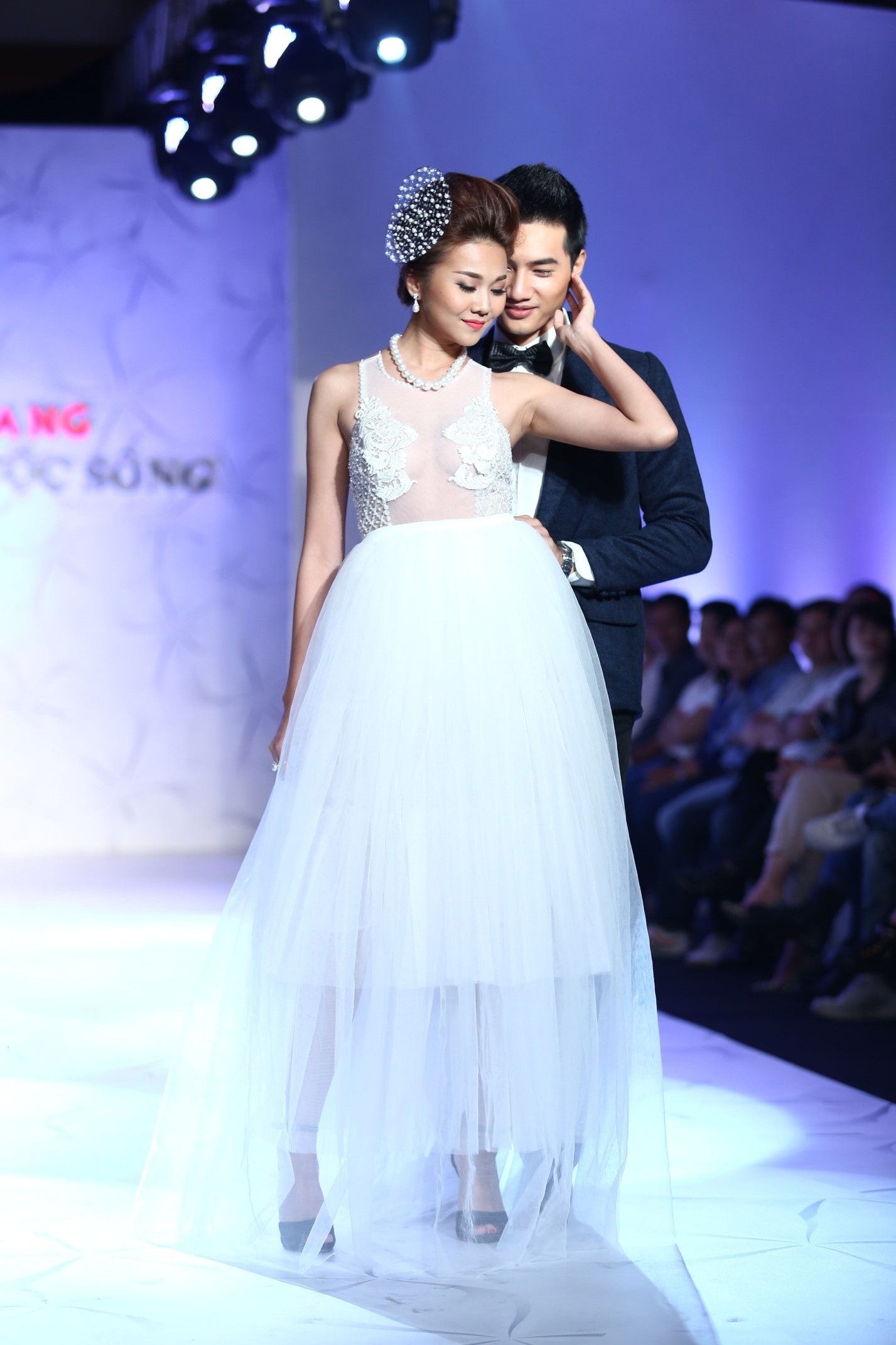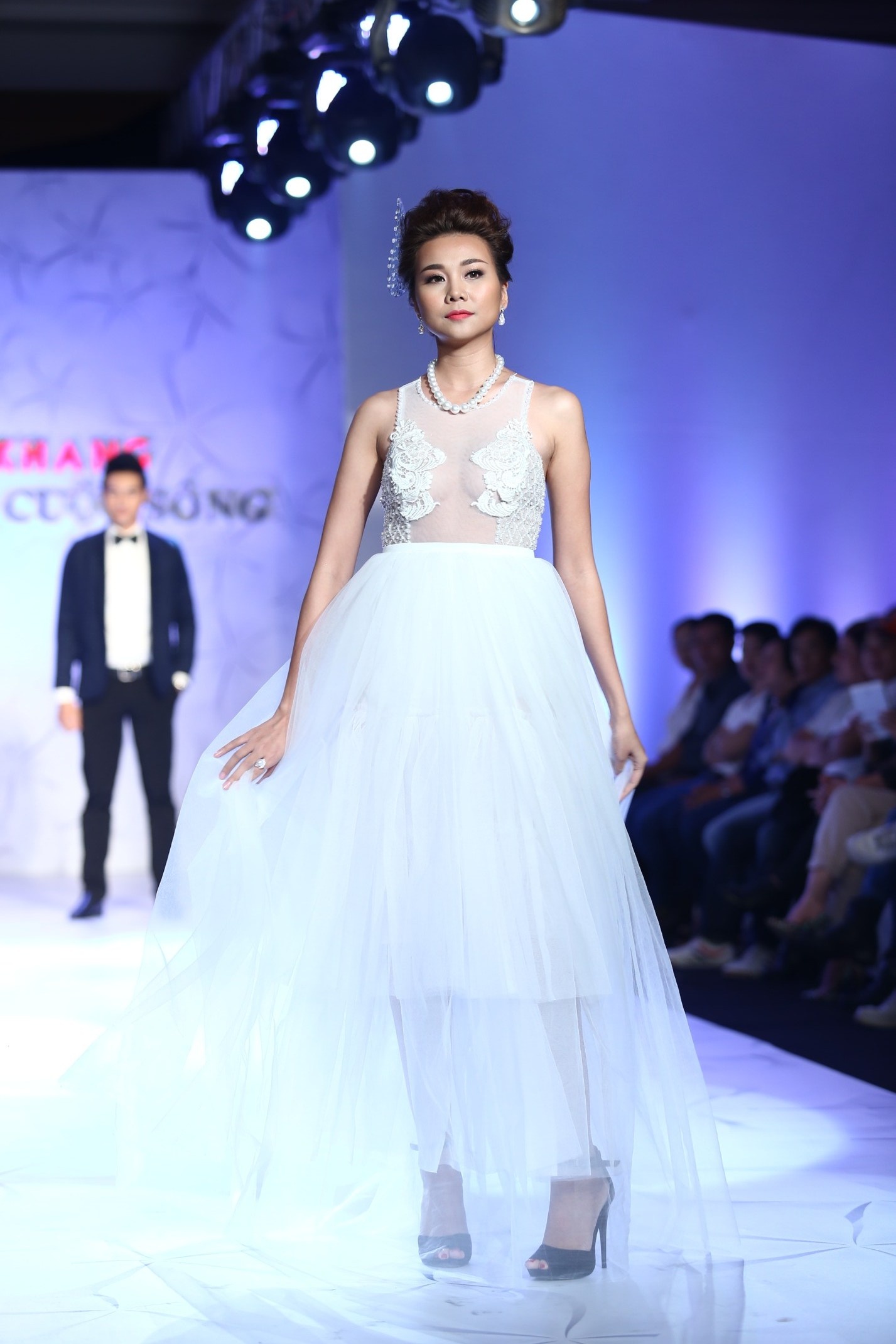| Trên sàn diễn bộ sưu tập váy cưới, siêu mẫu Thanh Hằng diện một thiết kế voan trắng tinh tế, có điểm nhấn voan ren gợi cảm ở thân áo, chân váy đơn giản với lớp voan lưới bồng xòe. Bộ phụ kiện ngọc trai tăng sức hút quyến rũ cho nàng vedette khi xuất hiện chốt màn. Bộ trang sức được làm bằng ngọc trai tự nhiên, có giá bán lên đến 1,4 tỷ đồng. |