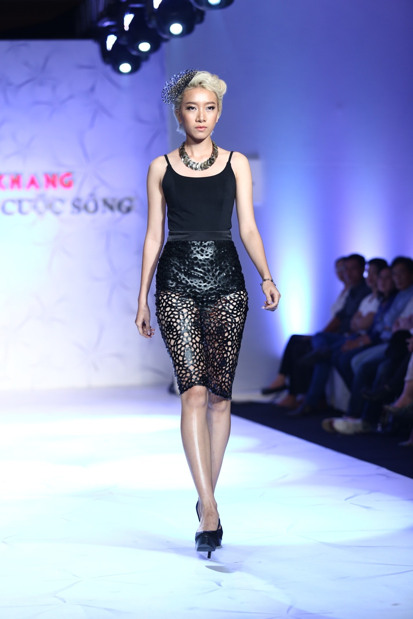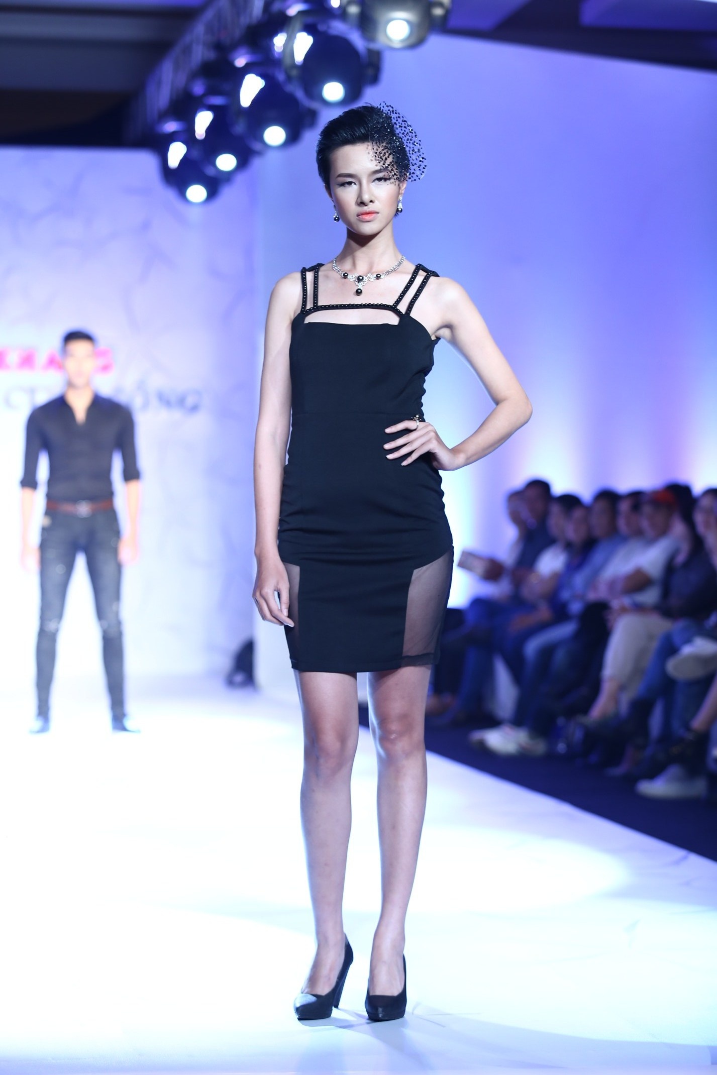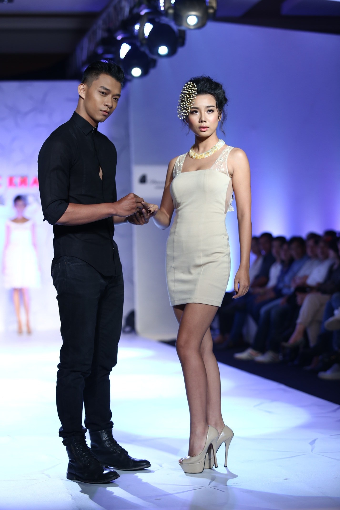 | Sau đó, chính nam người mẫu là người giúp Thanh Hằng "thay" trang phục trên sàn diễn bằng cách cởi bỏ lớp váy voan bên ngoài để lộ thiết kế jumpsuit gợi cảm bên trong. |