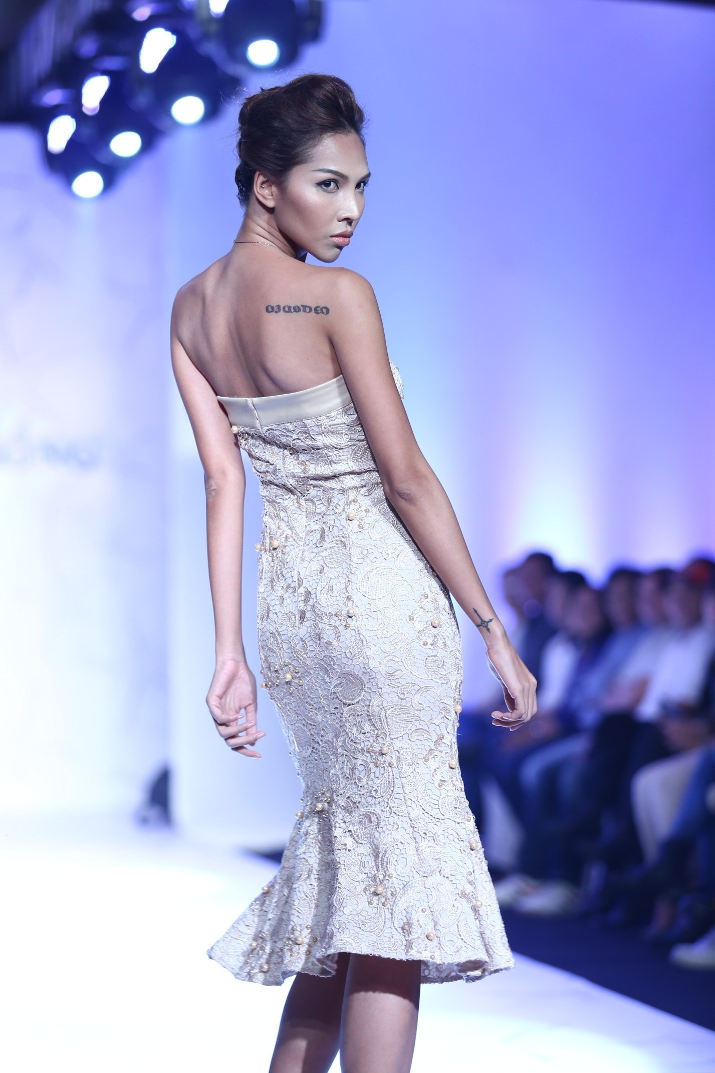 | Minh Triệu khoe vai trần sexy trong mẫu váy ren đính hạt ngọc trai cao cấp. |