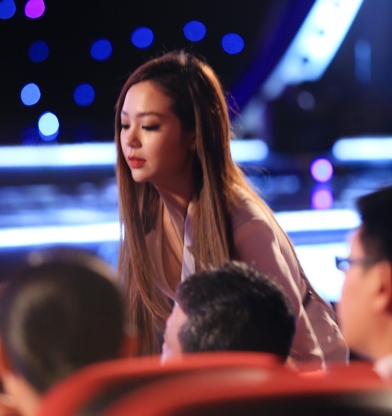 Minh Hằng dưới hàng ghế khán giả lên trao giải. |