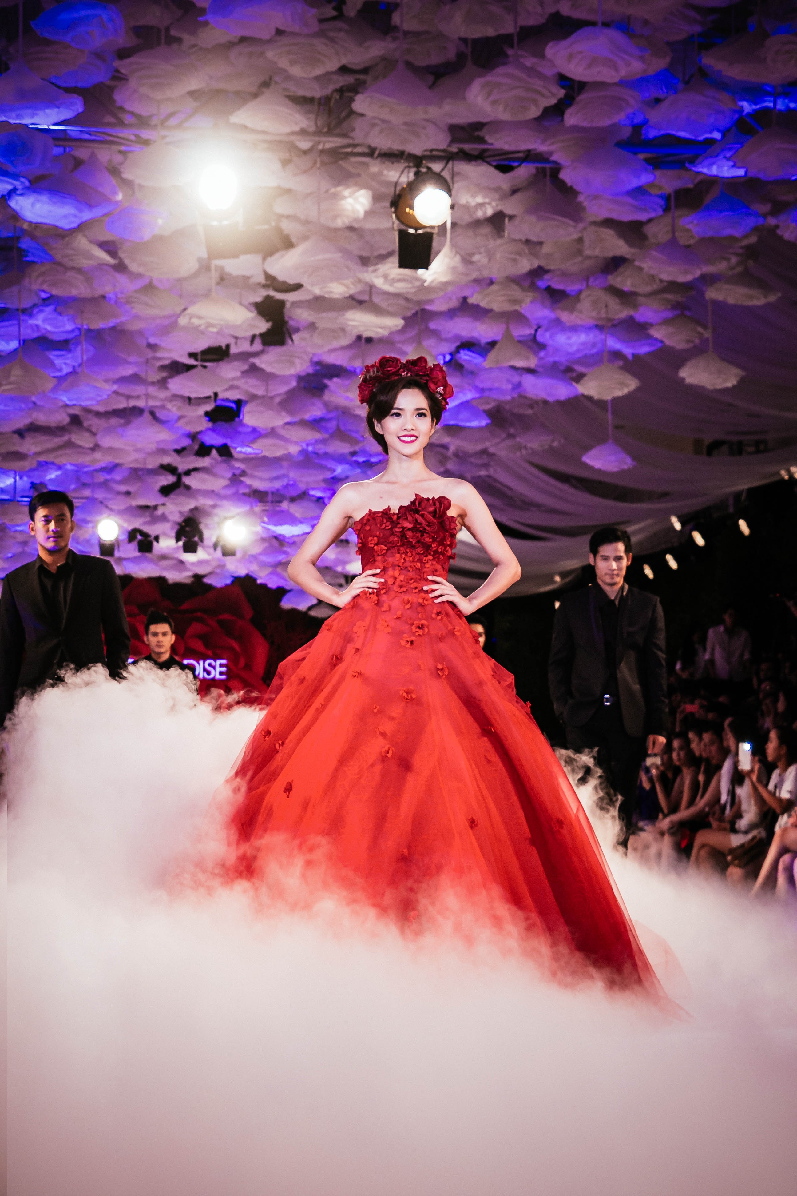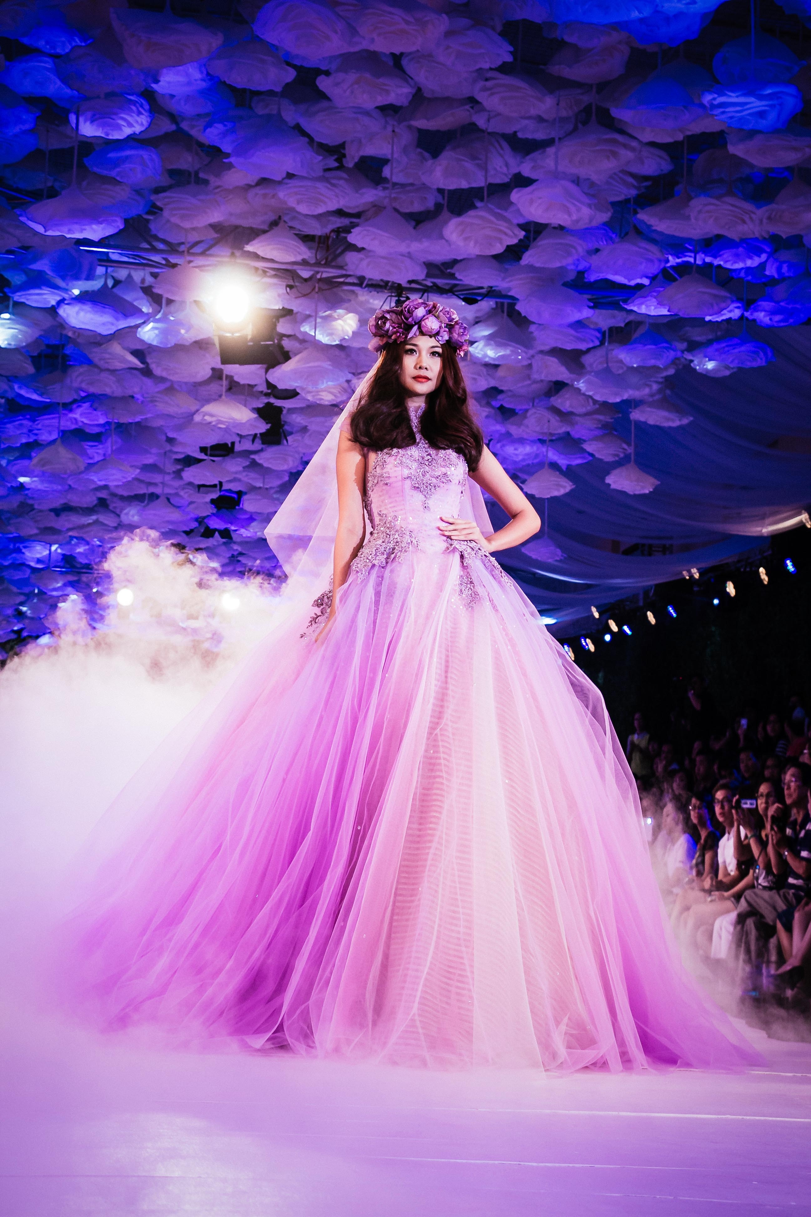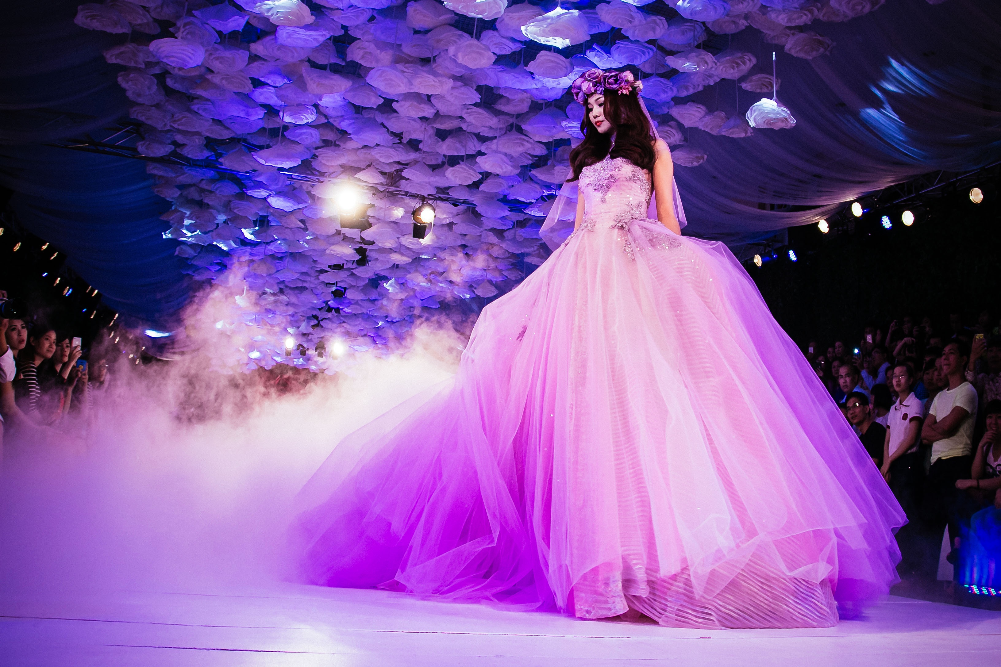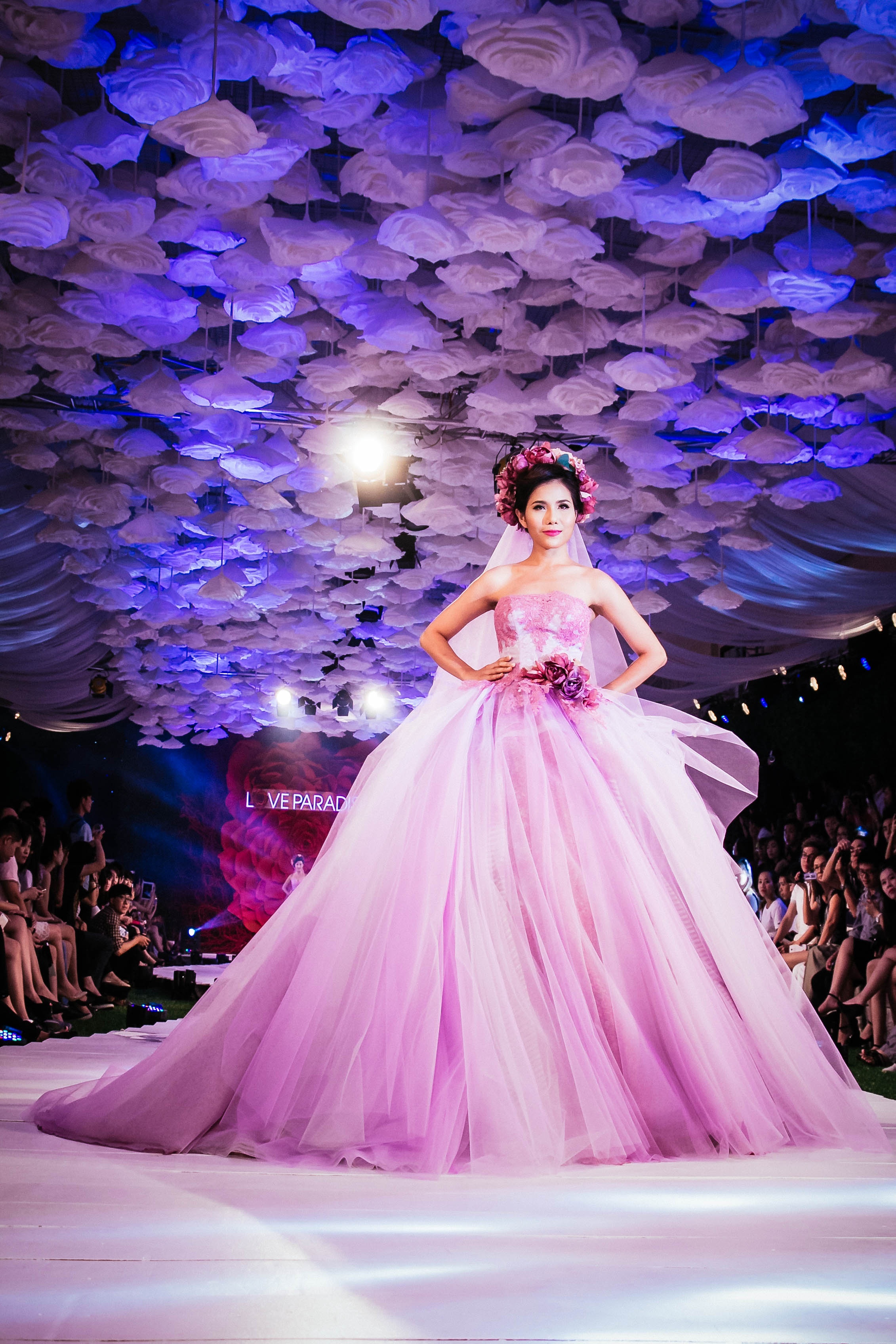 | Thanh Hằng là người mẫu duy nhất của đêm diễn được mặc chiếc váy cưới trị giá 200 triệu đồng của NTK Anh Thư. Váy cưới này còn được đính thêm 1.000 viên đá, 100 mét lưới pha màu từ tím sang hồng. |