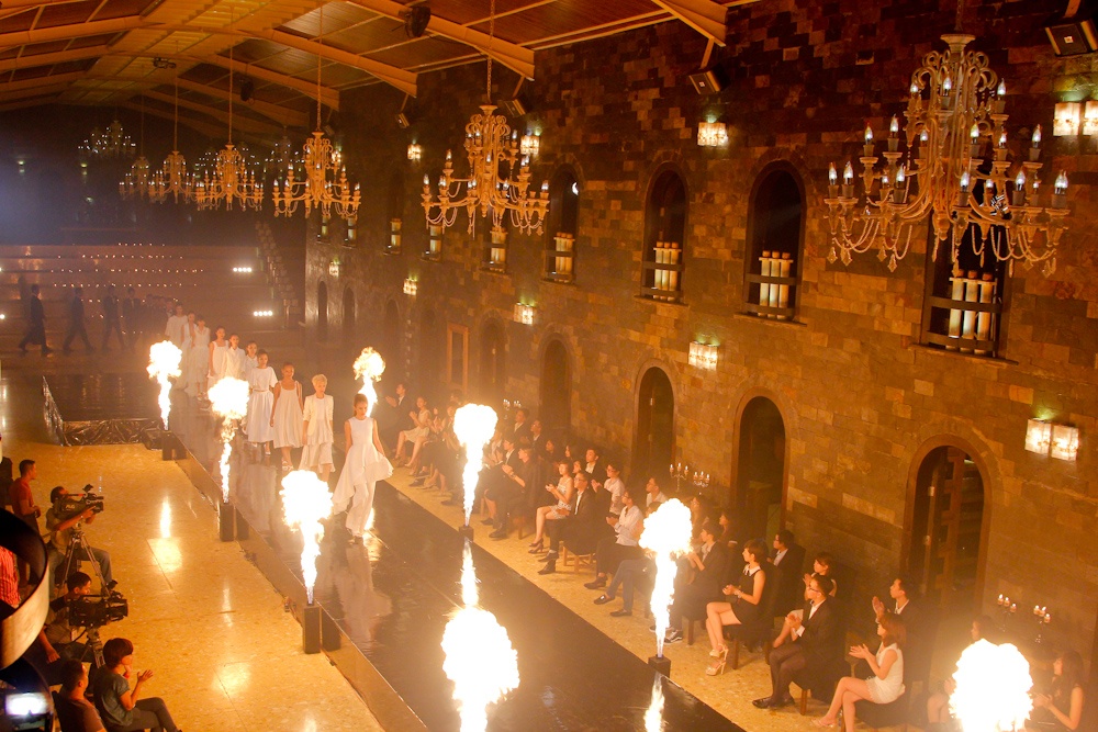 Tập catwalk với cầu dốc và diễn thời trang hai bên phụt lửa