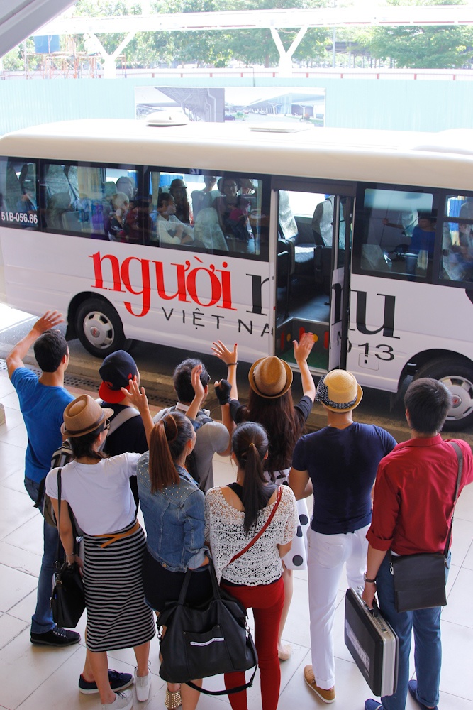 | Các thí sinh thấy hứng thú với chiếc xe bus có in dòng chữ ''Người mẫu Việt Nam 2013''. |