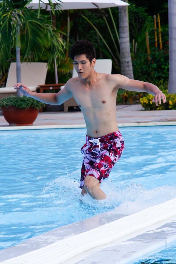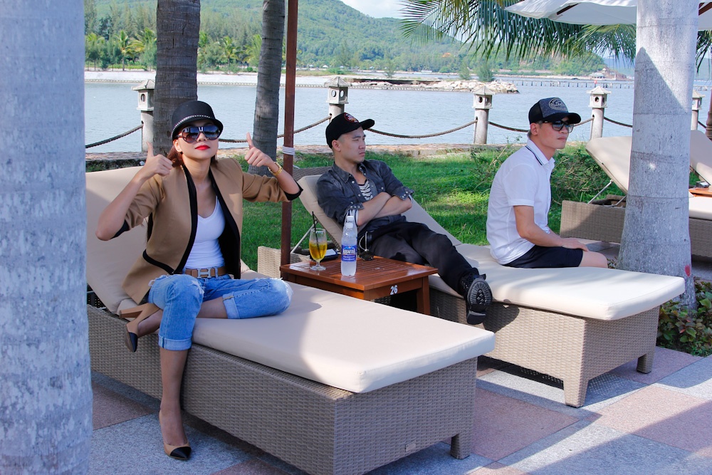 | Bộ tam giám khảo quan sát các chàng trai cô gái luyện tập phía hồ bơi. |