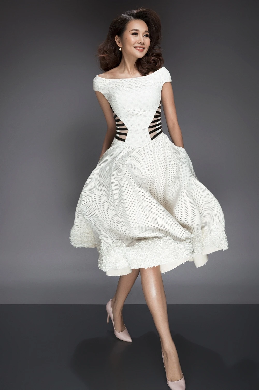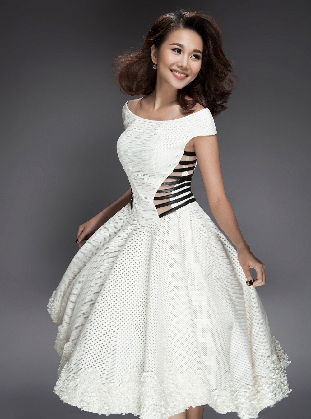 | Thanh Hằng chuộng hai gam màu trắng đen bởi sự đơn giản, tinh tế. Thiết kế trong ảnh có phom quây gợi cảm, khoe vai trần quyến rũ của diễn viên Siêu nhân X. |