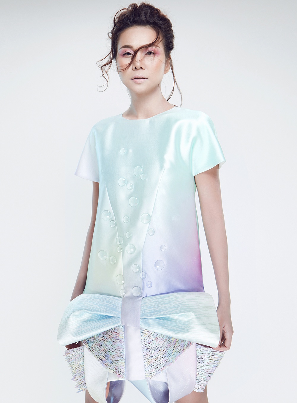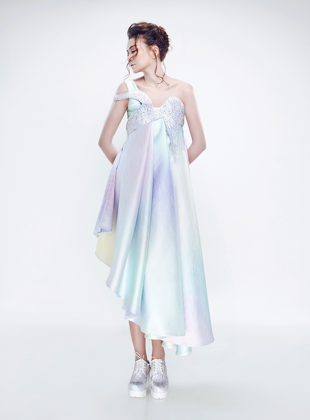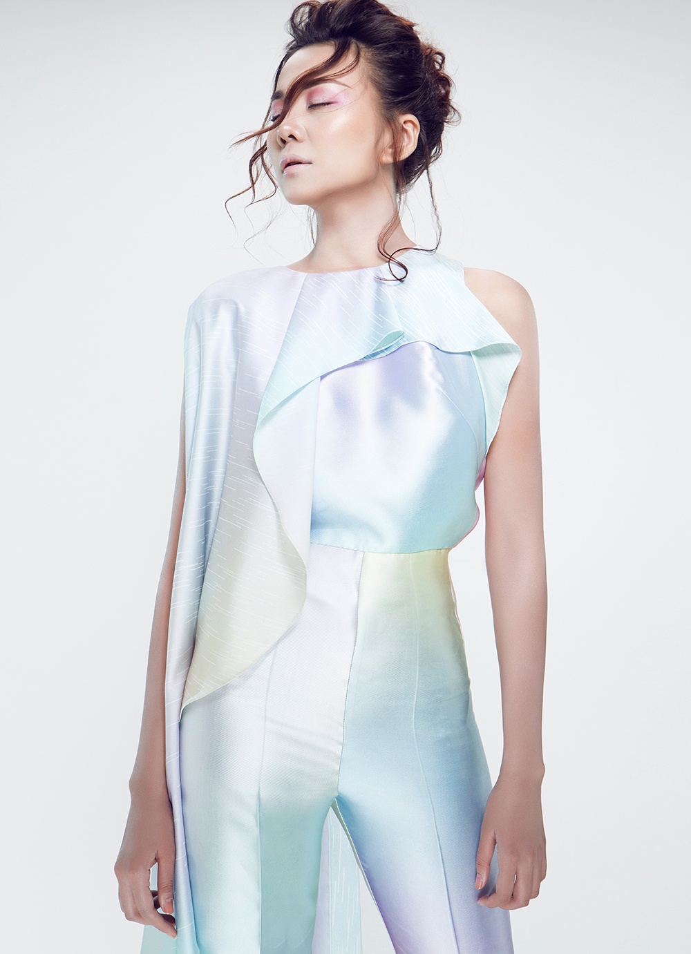 | Chất liệu của No.8 được xử lí công phu, in thử màu trước rồi cho dệt mới để tạo sự chuyển sắc óng ánh tự nhiên. Tông màu chủ đạo có sự biến chuyển từ gam trung tính đến ngũ sắc (hồng-vàng-lục-lam-tím) kết hợp độ bóng của chất liệu tạo hiệu ứng ánh hào quang mang cảm hứng vị lai – futuristic. |