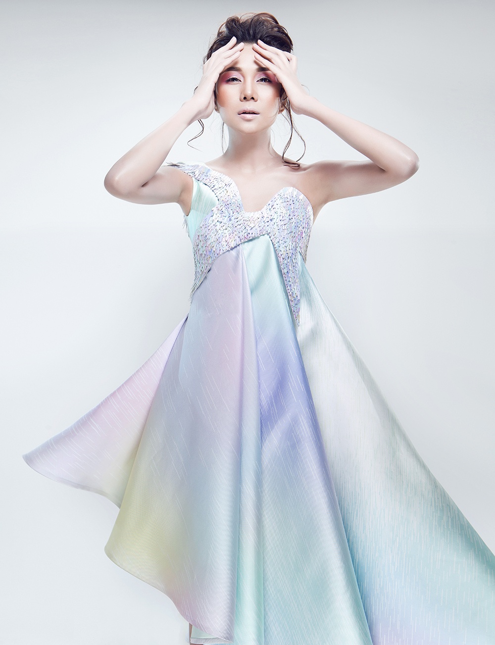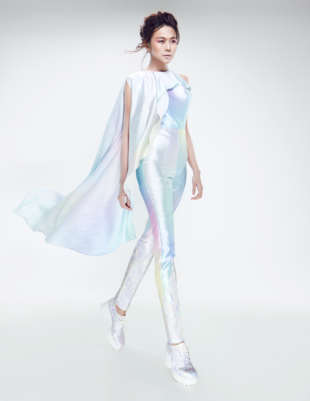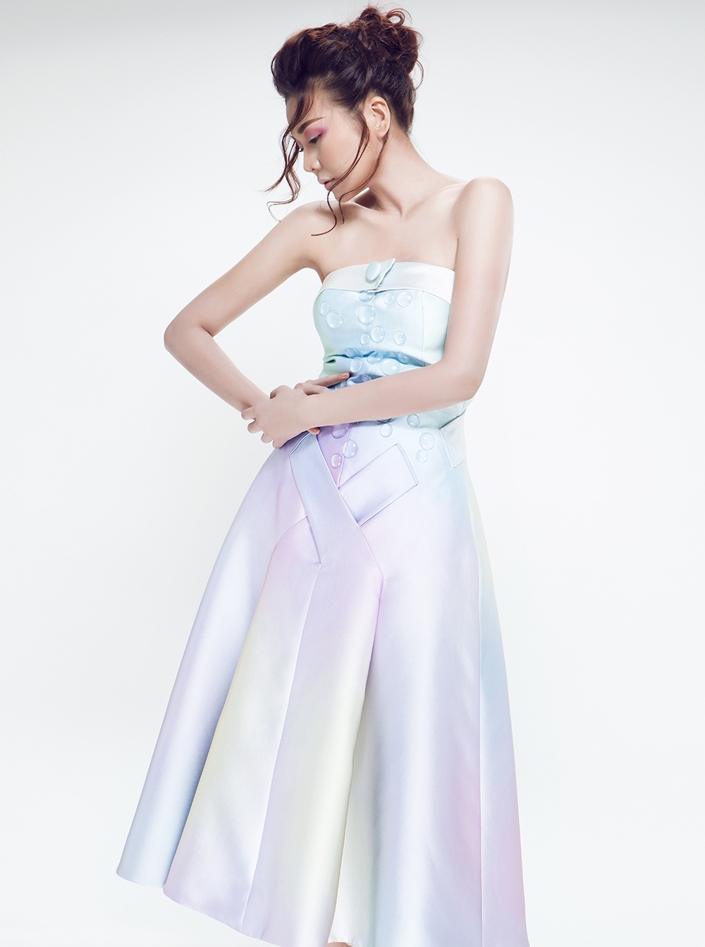 | Chất liệu của No.8 được xử lí công phu, in thử màu trước rồi cho dệt mới để tạo sự chuyển sắc óng ánh tự nhiên. Tông màu chủ đạo có sự biến chuyển từ gam trung tính đến ngũ sắc (hồng-vàng-lục-lam-tím) kết hợp độ bóng của chất liệu tạo hiệu ứng ánh hào quang mang cảm hứng vị lai – futuristic. |
