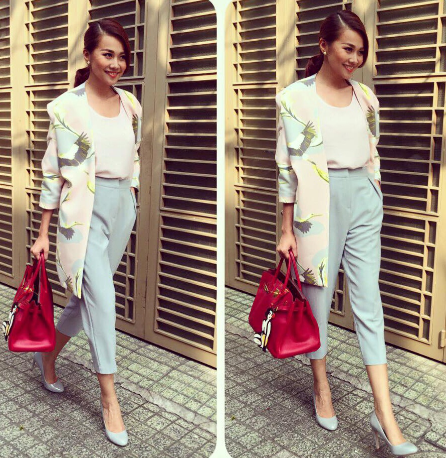 | Siêu mẫu Thanh Hằng giữ vững phong độ hình ảnh thời trang với những set đồ hợp xu hướng. Tuần này, cô diện bộ cánh gam màu xanh pastel và trắng nhã nhặn. Áo vest họa tiết hoa mùa hè nữ tính. Phụ kiện túi xách Hermes tông đỏ làm điểm nhấn. |