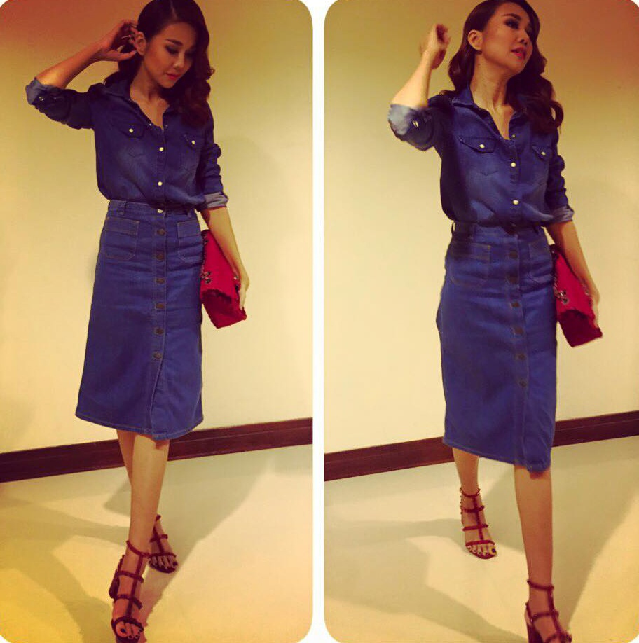 | Một ngày khác, siêu mẫu chọn set trang phục denim cá tính. Chân váy chữ A có điểm nhấn cúc ngay thân trước vừa cổ điển vừa hợp trào lưu. Phụ kiện giày dây mảnh tôn vóc dáng kiều diễm của người mặc. |