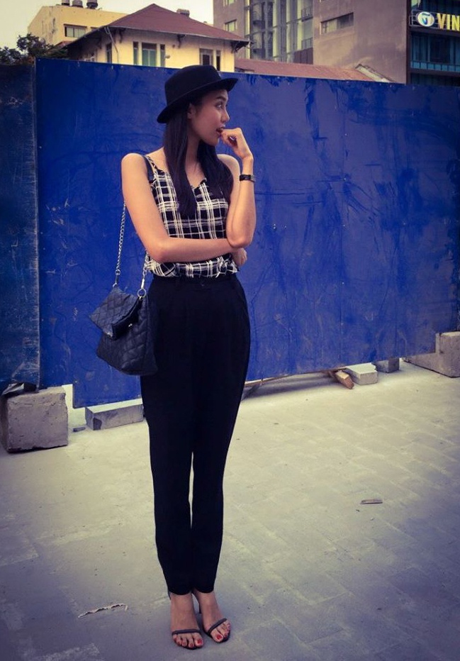 | Người mẫu Lan Khuê chọn trang phục nữ tính với áo hai dây và quần âu hiện đại. Người đẹp đi giày dây mảnh hợp với tổng thể mùa hè thoải mái. |