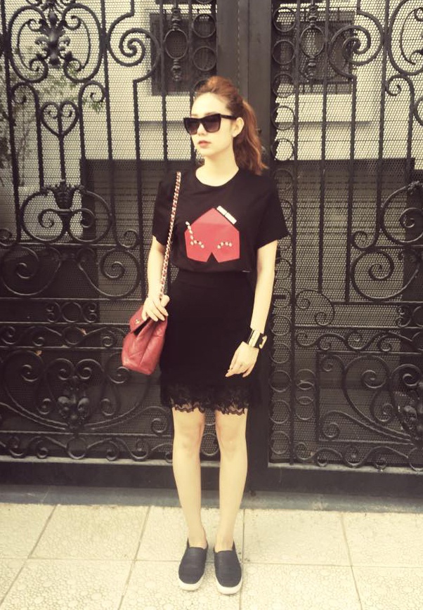 Cách mix ngẫu hứng giữa váy ren và áo thun giúp Minh Hằng thoải mái khi xuống phố. Người đẹp đi giày vans đế bệt thuận tiện cho việc di chuyển nhiều.