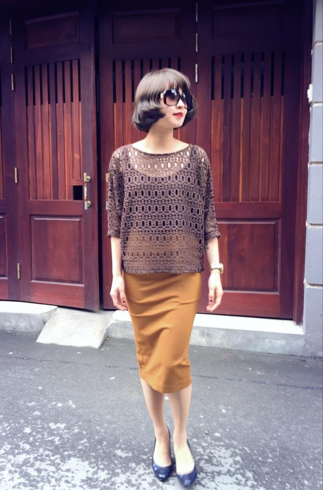 | Bà mẹ một con Mi Vân chọn set trang phục đồng sắc vàng đơn giản. Áo lưới mix cùng chân váy "bút chì" mang đến vẻ thanh lịch, bình dị cho cựu hot girl. |