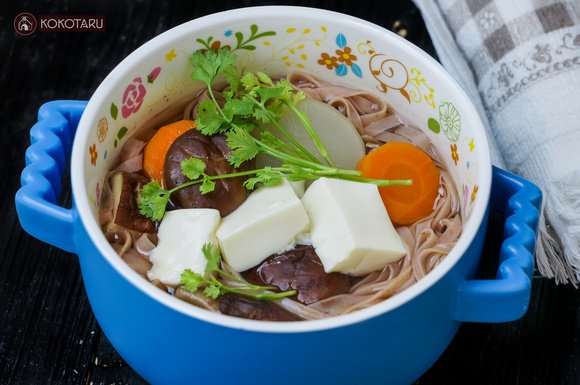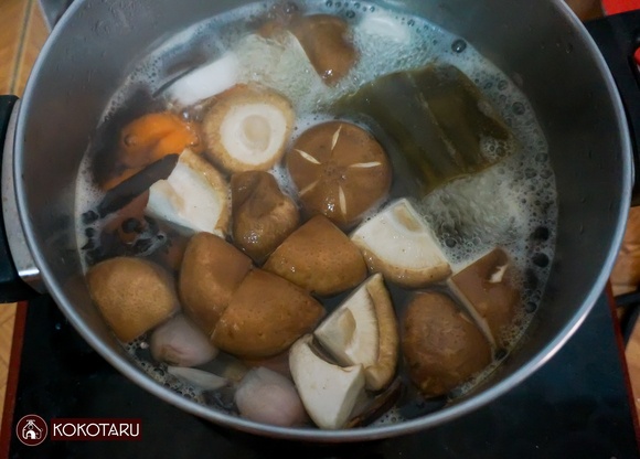 - Cà rốt, củ cải gọt vỏ, cắt khúc, nấm hương rửa sạch, thái miếng to, tất cả cho vào nồi nước dùng, thêm nước mắm, nấu tới khi cà rốt và củ cải đều chín mềm. Lúc này nước canh cũng đã rất thơm và ngọt.