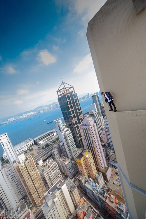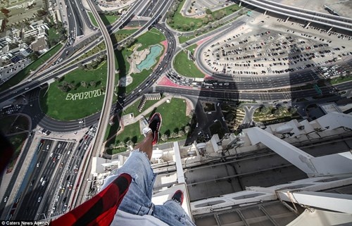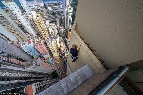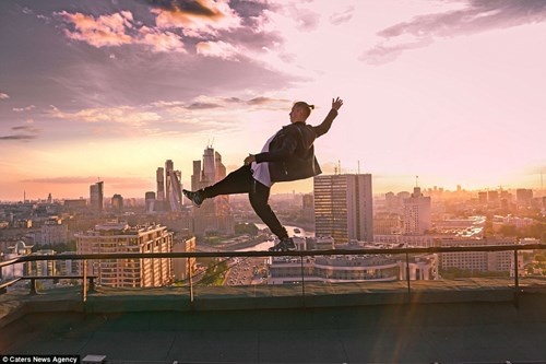 | Tại một tòa nhà màu xanh ở Moscow, Nga. Rõ ràng những bức ảnh của Oleg Sherstyachenko tạo ra ấn tượng mạnh. Tuy nhiên, sẽ là nguy hiểm và "ngu ngốc" như lời bình của một cư dân mạng, nếu ai đó có ý định bắt chước thanh niên nay. |